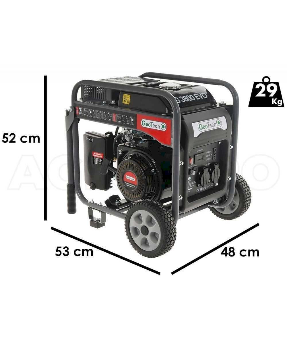 Le générateur de courant Geotech iG 3800 EVO est une machine très pratique et simple à utiliser. Il est aussi simple à transporter grâce à ses deux roues et aux poignées rétractables. Le groupe est en mesure d’exprimer une puissance maximale de 3.8 Kw. Il monte un moteur 4 temps à essence EURO V de 212 cm3 e mesure d’exprimer une puissance nominale d’au moins 7.5 CV.