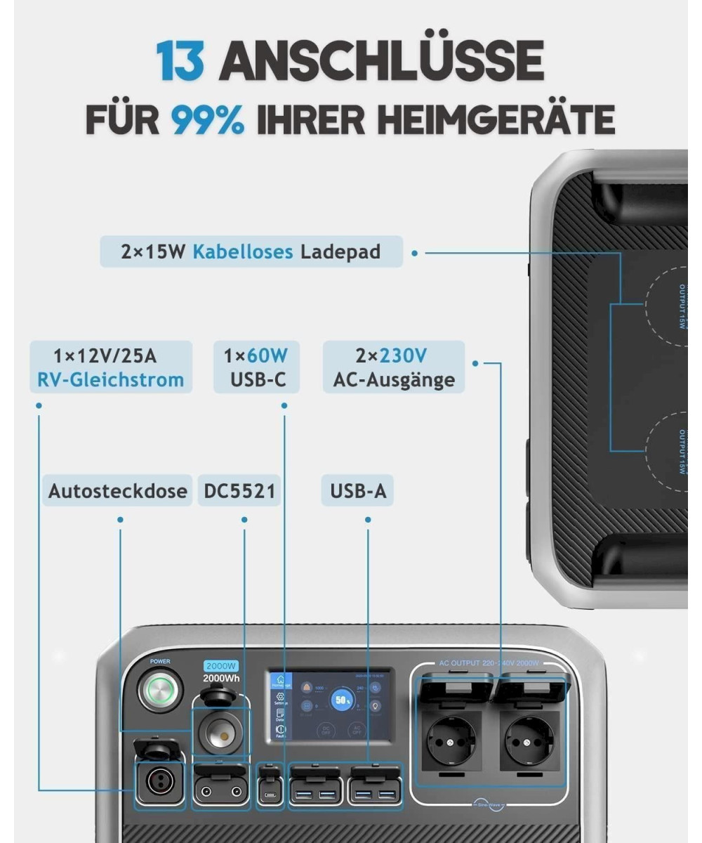 - [13 options de connexion] - 2 prises Schuko standard, USB-A, USB Type-C, connecteur voiture plus 2 coussinets de charge sans fil répondent à tous vos besoins, tandis qu'un connecteur d'alimentation CC 12 V/25 A alimentera vos travaux de bricolage.