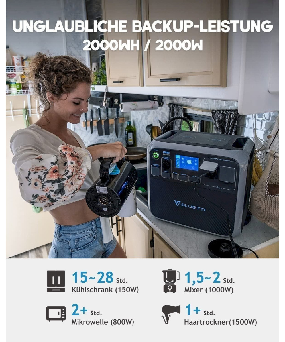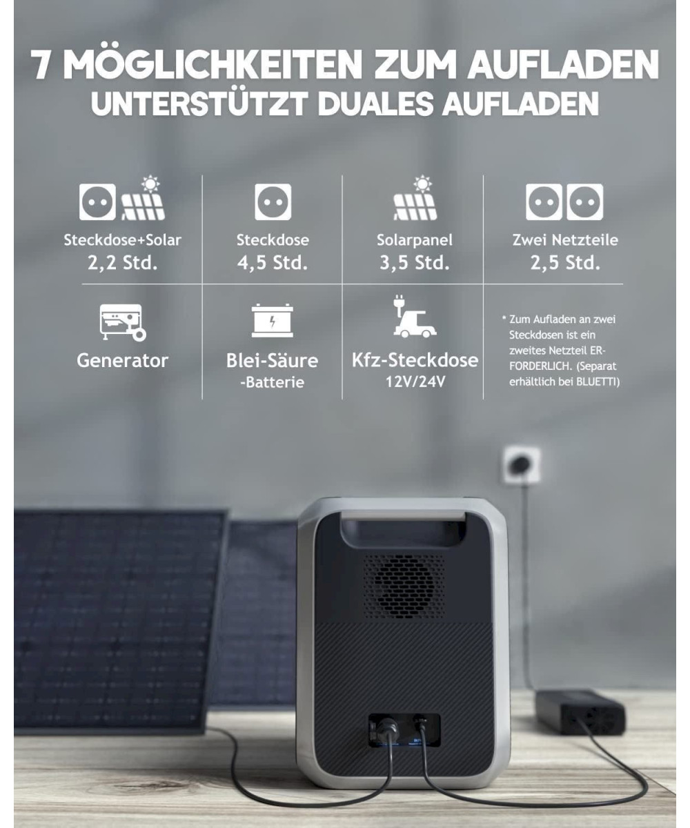 - [Charge super rapide] - L'AC200P prend en charge jusqu'à 700W Solar- und 500W Netz-Eingang, sodass Sie sie in 2,5 Stunden durch Solar + Netz oder mit zwei Netzteile vollständig aufgeladen können.