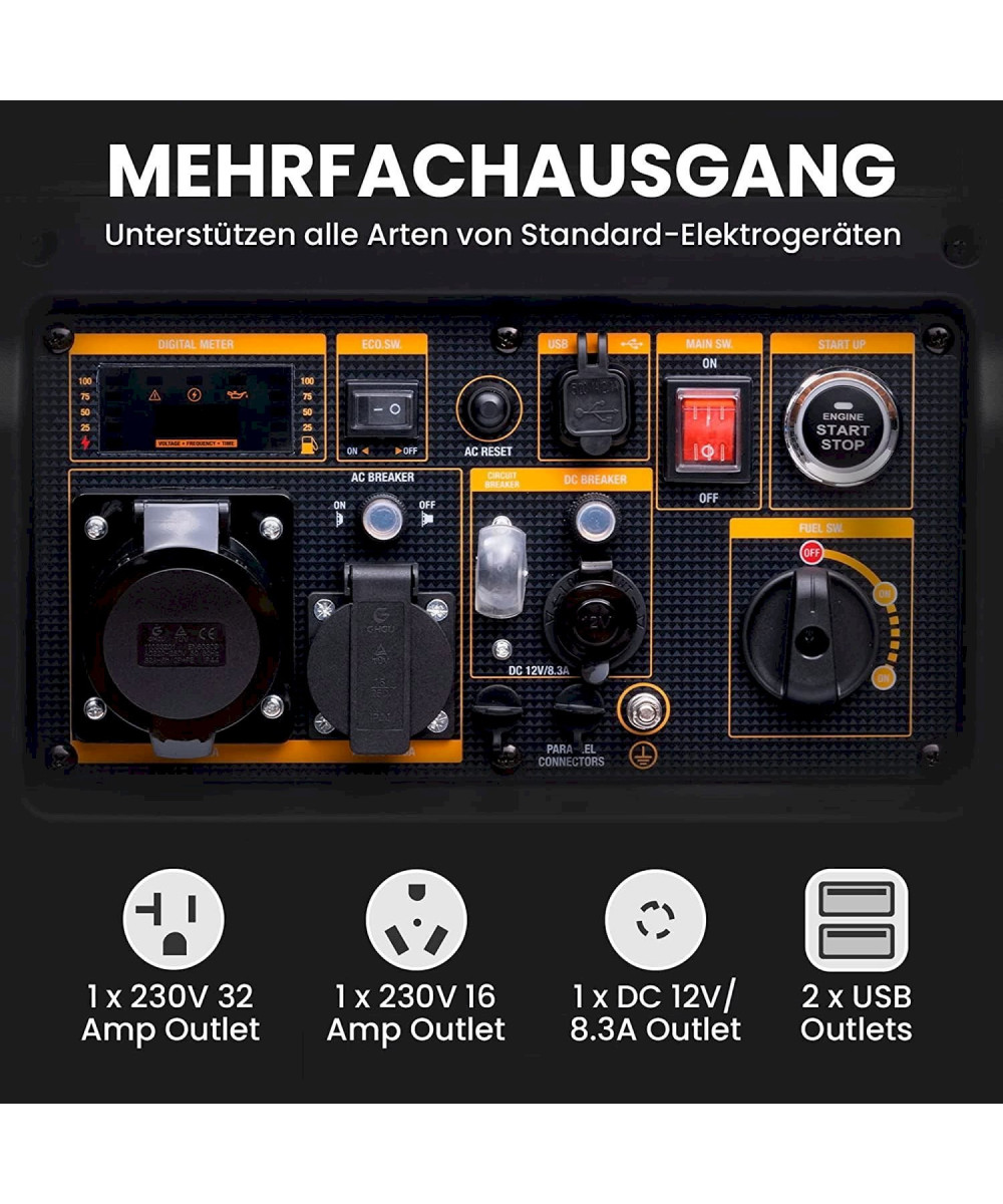 - Centre de contrôle numérique LED : affichage de la tension de sortie, du niveau d'essence, du temps de fonctionnement.