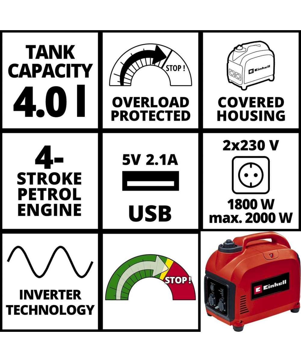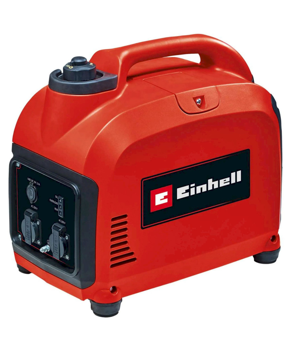 Le groupe électrogène (à essence) TC-IG 2000 Einhell s’utilise idéalement dans tous les lieux où une source de courant indépendante est nécessaire : dans les jardins ouvriers, sur les chantiers, en camping, dans les ateliers et garages, ou pendant des vacances dans des bâtiments isolés, des chalets forestiers ou de montagne, ou encore des cabanes de pêcheurs. Il est entraîné par un moteur 4 temps puissant, robuste et à faibles émissions avec technologie à onduleur pour une sortie de courant sans pics de tension, ce qui permet également de connecter et de faire fonctionner des appareils sensibles. Le groupe électrogène fournit une puissance continue de 1 800 W en régime permanent, la puissance maximale s'élevant à 2 000 W. L’alimentation est délivrée au moyen de deux prises de courant 230 V, auxquelles tous types d’appareils peuvent être connectés. Le groupe électrogène dispose en outre de deux prises USB. La structure fermée assure un fonctionnement silencieux. Le groupe électrogène est protégé en complément par un disjoncteur de surcharge et une sécurité manque d’huile. Il se démarre très simplement au moyen d’un câble, et la poignée facilite son déplacement.