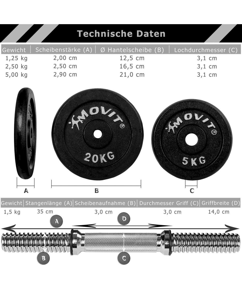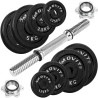 Diamètre d'alésage des poids 31 mm. Diamètre de la barre 30 mm. Poids total: 30 kg