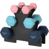 Dotées d'un revêtement en néoprène, les haltères sont agréables au toucher et assurent une utilisation sans danger. Grâce à ce lot de différents poids, vous pouvez faire un programme adapté et augmenter votre force musculaire. Un support de rangement est offert pour que le tout prenne peu de place chez vous.