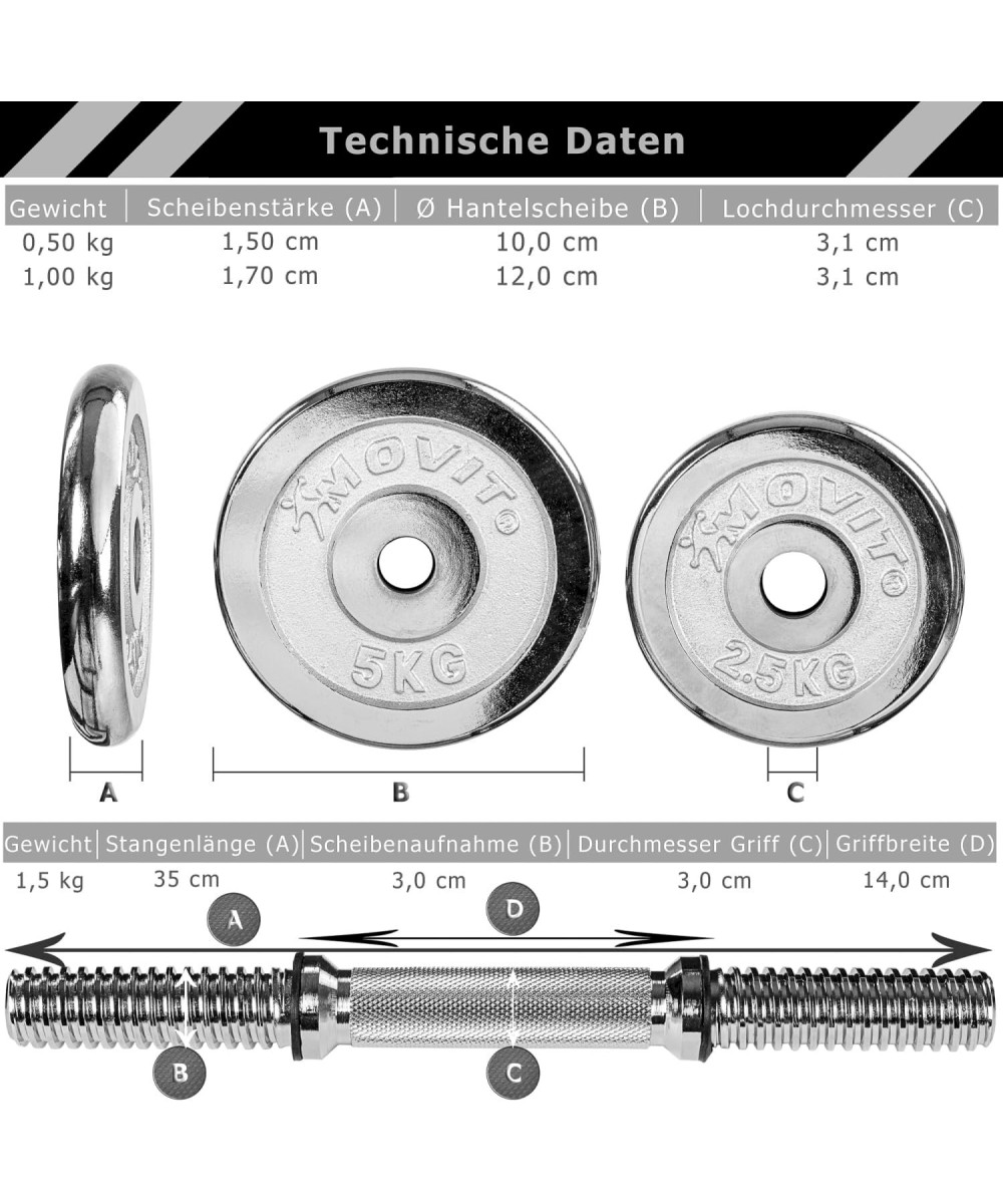 MOVIT PRO CHROME EST COMPOSÉ DE: L'ensemble de 2 haltères courts 15 kg 2 x 7,5 kg de poids, qui se répartissent comme suit : 8 x 1,0 kg disque en chrome, 4 x 0,5 kg disque en chrome, 2 x barre d'haltère, 4 x fermeture en étoile