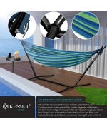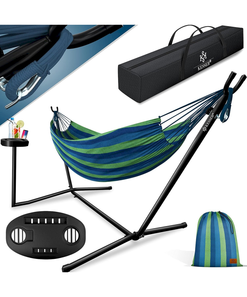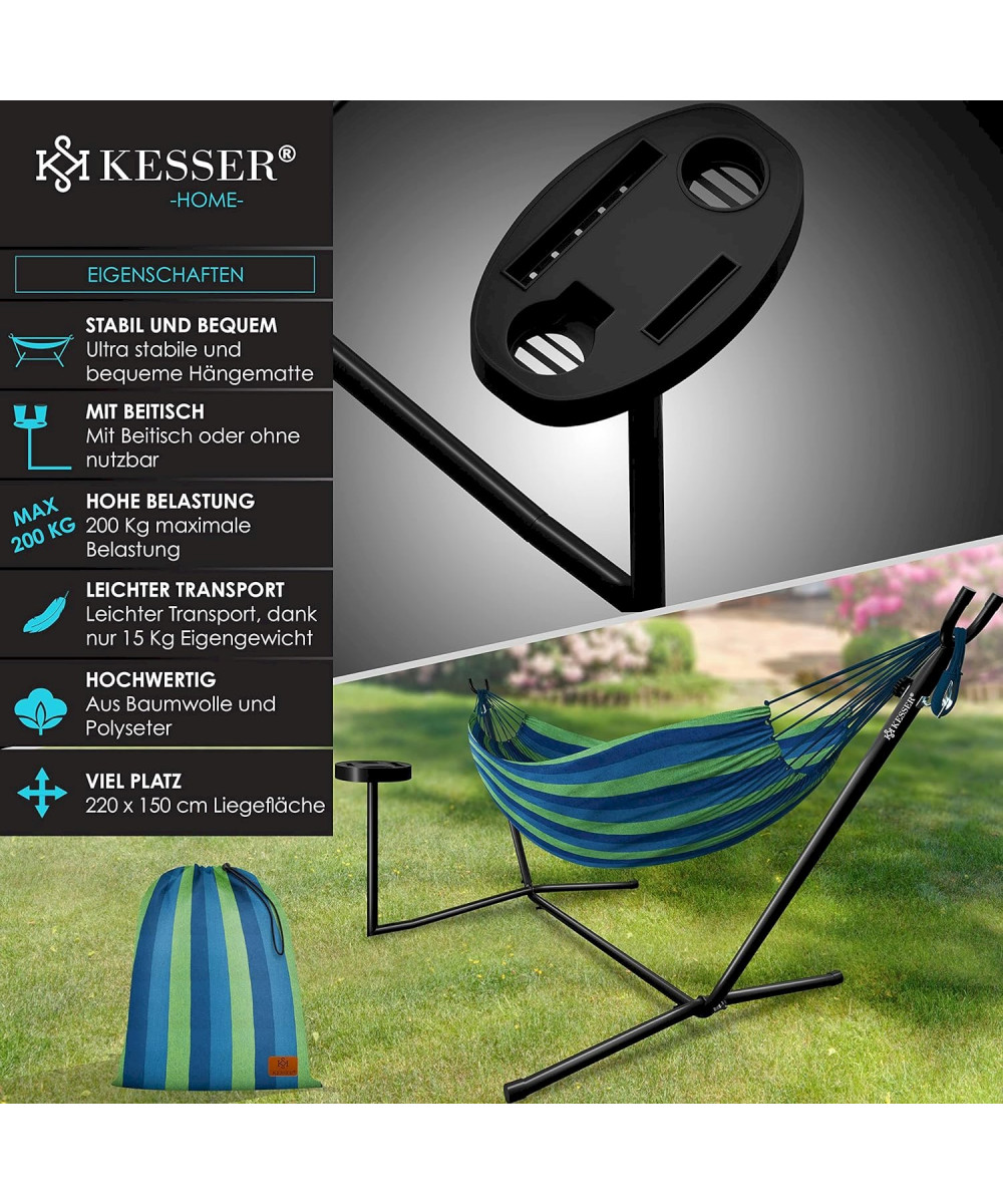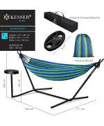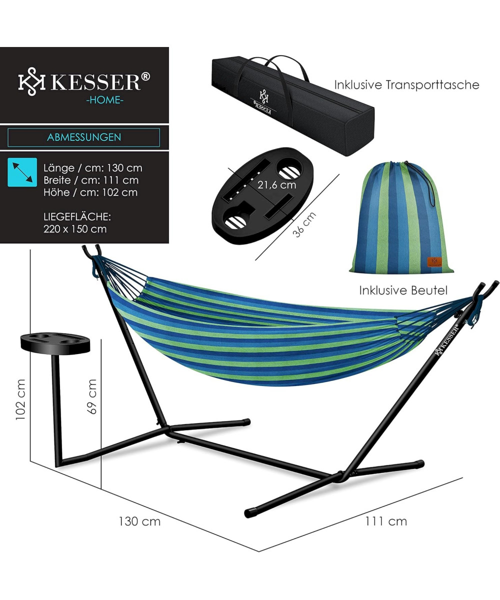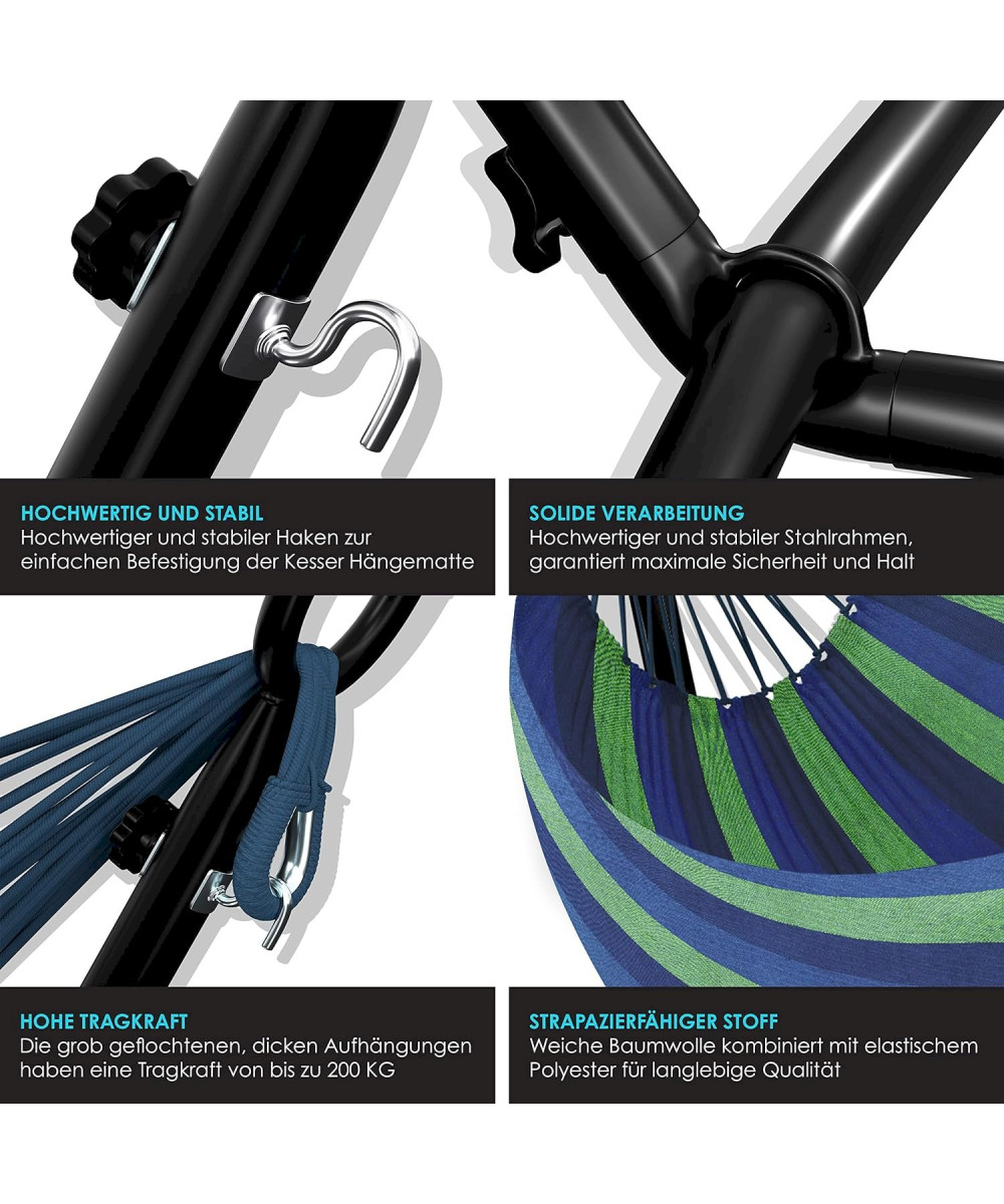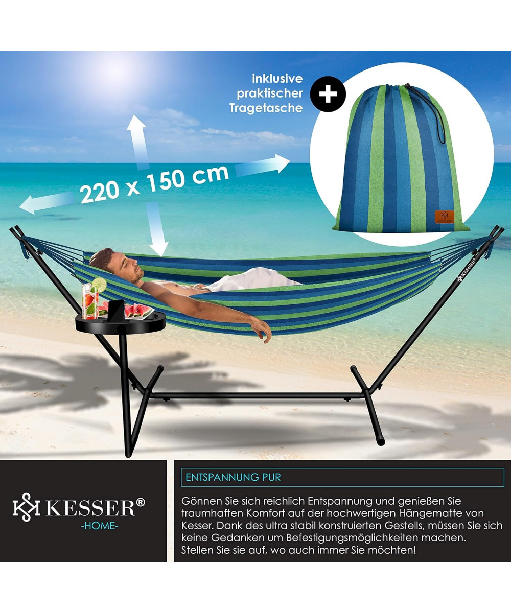 Détendez-vous aussi bien à l'intérieur qu'à l'extérieur avec le hamac de voyage extrêmement robuste et résistant de la marque Kesser. Grâce au cadre en acier de qualité supérieure et stable, vous pouvez laisser le cadre de notre hamac debout même par mauvais temps dans le jardin - Grâce au matériau de qualité supérieure, l'eau roule sur la surface et empêche la formation de rouille. Nous vous garantissons ainsi un hamac extrêmement durable avec lequel vous pourrez vous détendre encore beaucoup d'été.