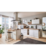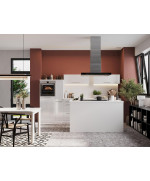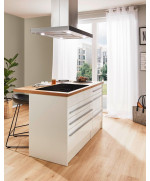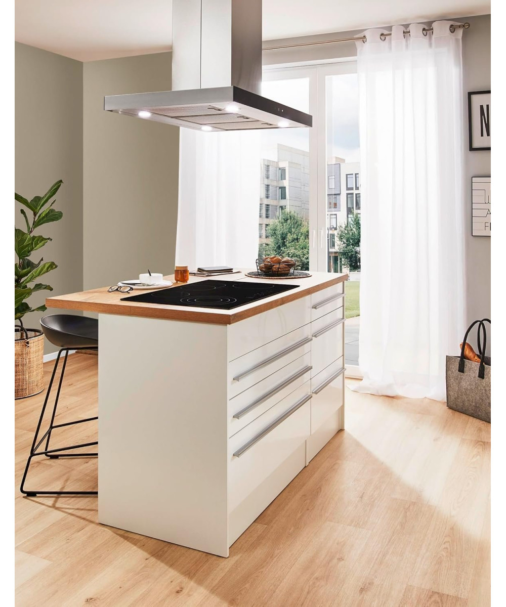 Die praktische schräge Bauform des Dunstabzugs ist platzsparend und schützt vor Kopfstößen beim Kochen. Das moderne Design der Kopffreihaube ist ein echtes Highlight in der Küche.
