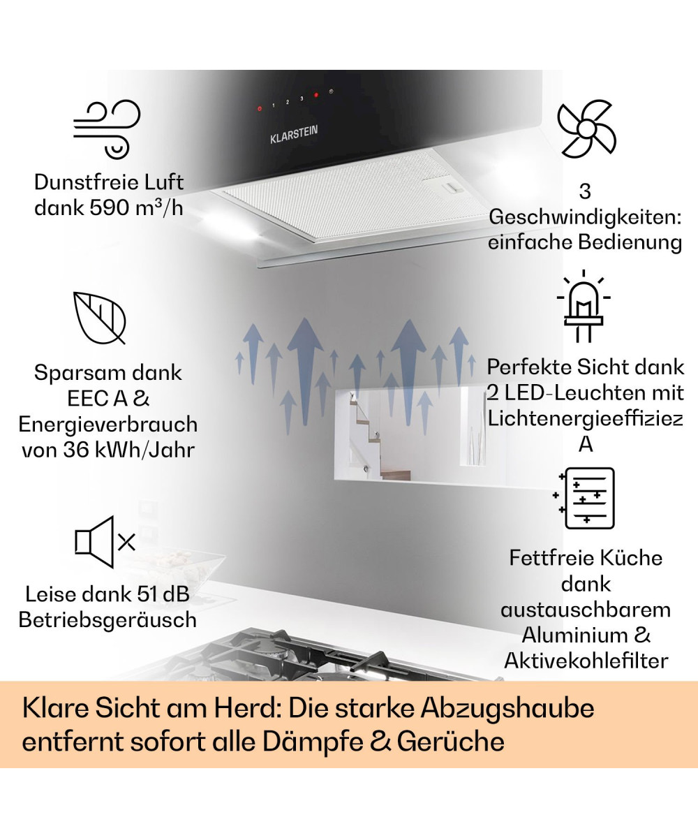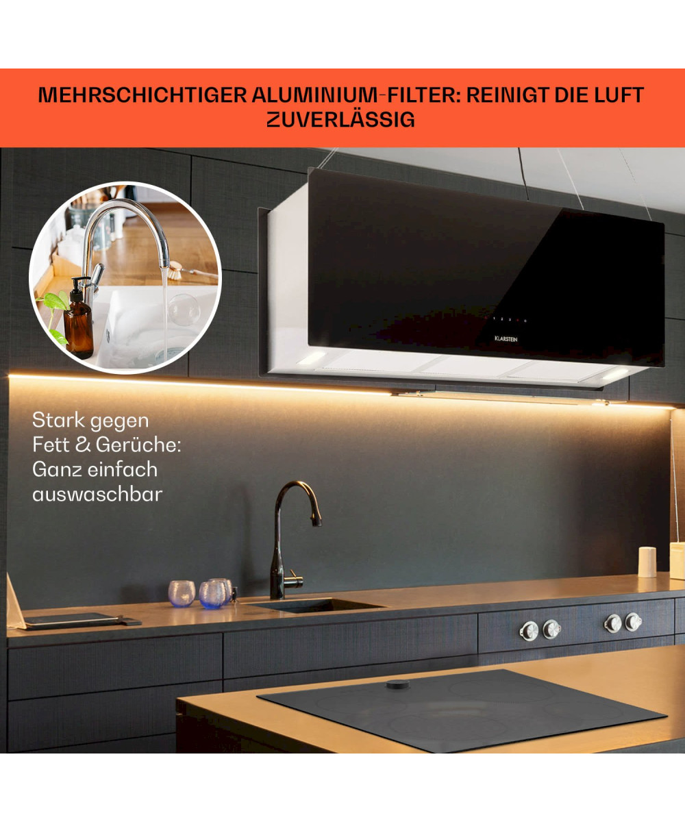 Parfait pour les îlots de cuisine. La hotte aspirante Klarstein Kronleuchter XL apporte une touche finale luxueuse aux tables de cuisson en pose libre, comme son nom l'indique. Au bout de ses câbles en acier ultra résistants de 60 cm de long, la hotte pend librement au plafond élimine efficacement toute odeur de cuisson. Grâce à ses trois niveaux d'intensité, elle fait circuler inlassablement la vapeur avec un débit allant jusqu’à 590 m³/h, libérant ainsi l’air de la cuisine de la graisse et de la fumée. Elle est idéalement conçue pour les grandes cuisines américaine en îlot. L'éclairage LED intégré de la surface de cuisson diffuse une lumière blanche claire à tout moment, tandis qu'une lumière LED colorée indique sur le panneau de contrôle le niveau d'intensité enclenché.