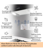 L'aspect extérieur de la hotte pour ilot Klarstein Kronleuchter XL est élégant avec son design Pure Ambience.La face avant et arrière sont revêtues d'un luxueux verre de sécurité blanc, tandis que les côtés sont en inox brossé.