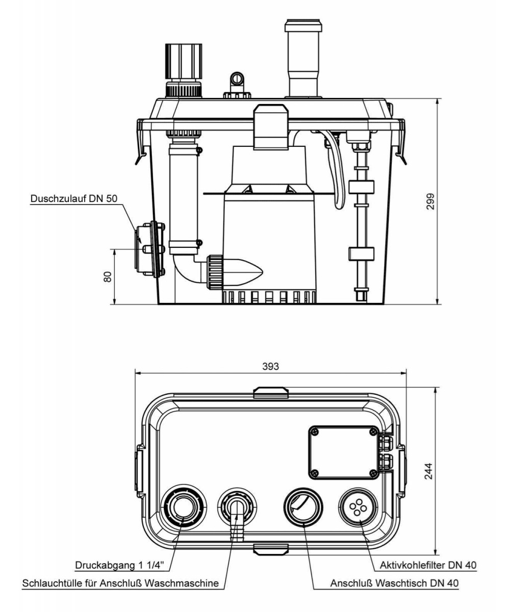 Schmutzwasser-Hebeanlage, steckerfertig komplett mit Pumpe und im Behälterdeckel integriertem Schaltgerät mit Alarmsummer und potentialfreien Kontakt für Alarmmeldung sowie Rückschlagklappe, Duschzulauf und Schiebestück DN 40.
