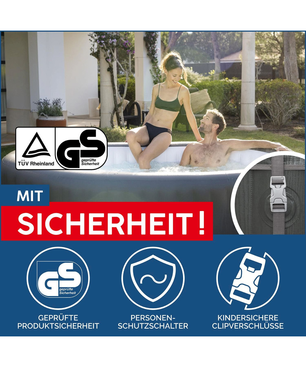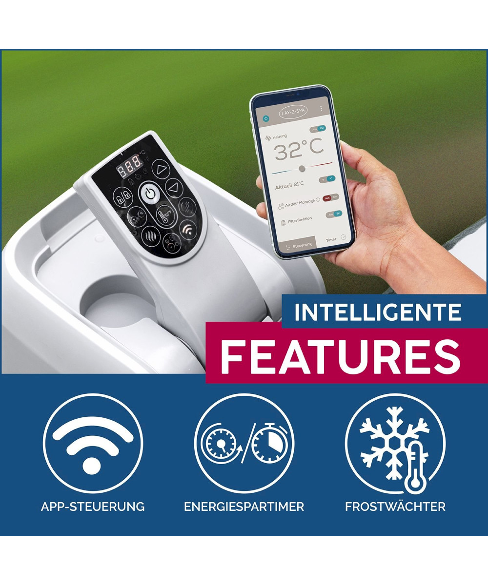 La structure de support interne MaxHold™ assure en permanence une résistance à la pression de l'air et une stabilité optimales. Le spa LAY-Z-SPA® XXL WLAN Mauritius AirJet™ vous offre non seulement une pure détente, mais aussi des fonctions intelligentes qui améliorent votre confort. La fonction de chauffage automatique Freeze Shield™ protège l'unité de pompage et le liner de la piscine contre les dommages pendant la saison froide et vous permet de profiter de votre bain toute l'année. Le système de chauffage programmable vous permet de programmer le processus de chauffage jusqu'à 40 jours à l'avance.