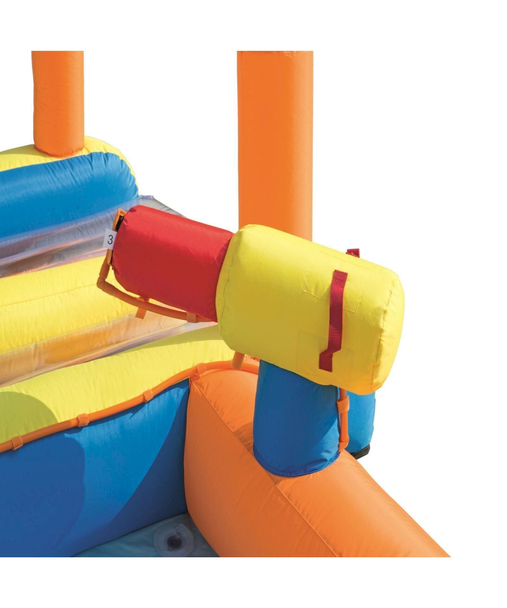 Le parc respecte toutes les normes de sécurité de ATSM et est construit avec un matériau polyester enduit de PVC qui est durable mais à la fois procure une sensation confortable et agréable pour les enfants. Le souffleur électrique avec une puissance de 110-120V / 220-240V avec couvercle de sécurité GFCI gonfle le parc aquatique en moins de deux minutes.