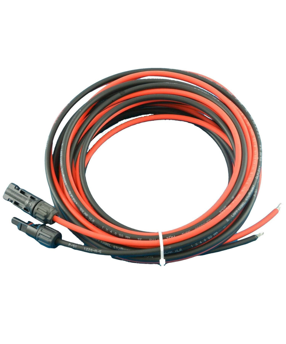 Die mitgelieferten Kabelsätze werden von unseren Mitarbeitern konfiguriert und geprüft. Sie enthalten die notwendigen Anschlüsse (Solar-Stecker, Batterieklemmen oder Aderendhülsen). Es werden TÜV geprüfte Solarkabel aus deutscher Produktion verwendet.