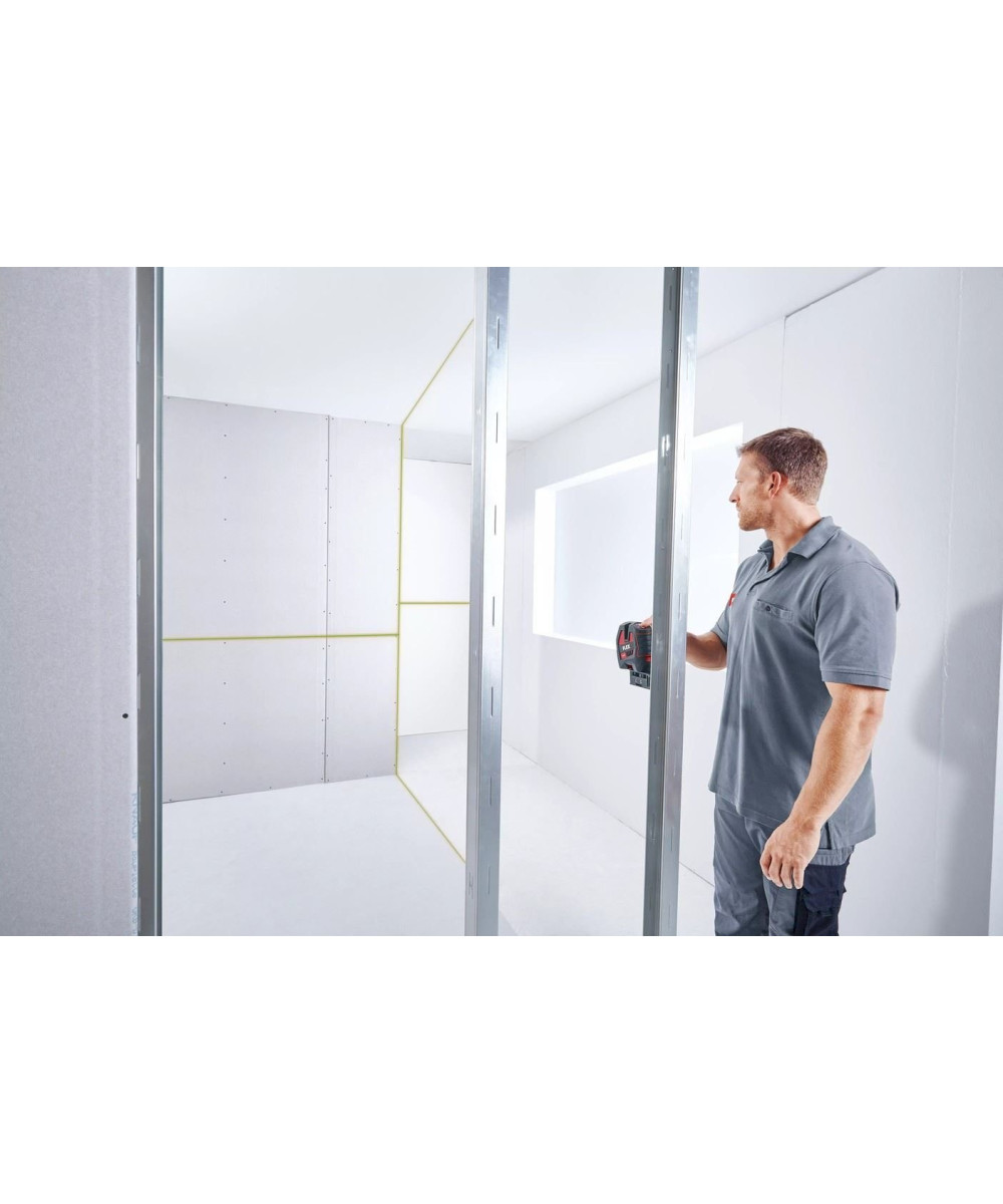 - Avec une ligne laser horizontale et deux lignes laser verticales à 90° plus aplomb (ligne laser rouge), commutables individuellement