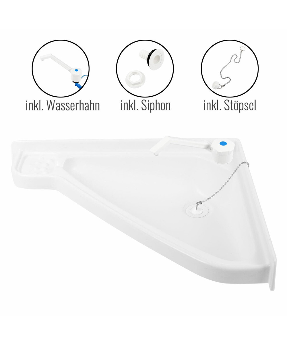 L'évier de coin caravane avec coque de savon intégré est un package défini comprenant un robinet et un siphon. Avec les dimensions 415 x 350 x 60 mm, elle peut être parfaitement utilisée dans les marques de caravanes et de camping-car communes telles que Hymer, Dthleffs ou Fendt. L'évier se compose d'un plastique ABS extrêmement léger et cassé et offre une récréation pour le savon en plus de la coquille pratique. Le robinet fourni à 12 volts est monté sur la piscine avec un trou de Ø 20 mm. Une fois cultivé, il a une hauteur de 135 mm et tourne et pivote. L'ensemble d'eau (drain) avec un angle de 90 °, un tuyau de 3/4 ’et une remise (Ø 23 mm) complètent le système.