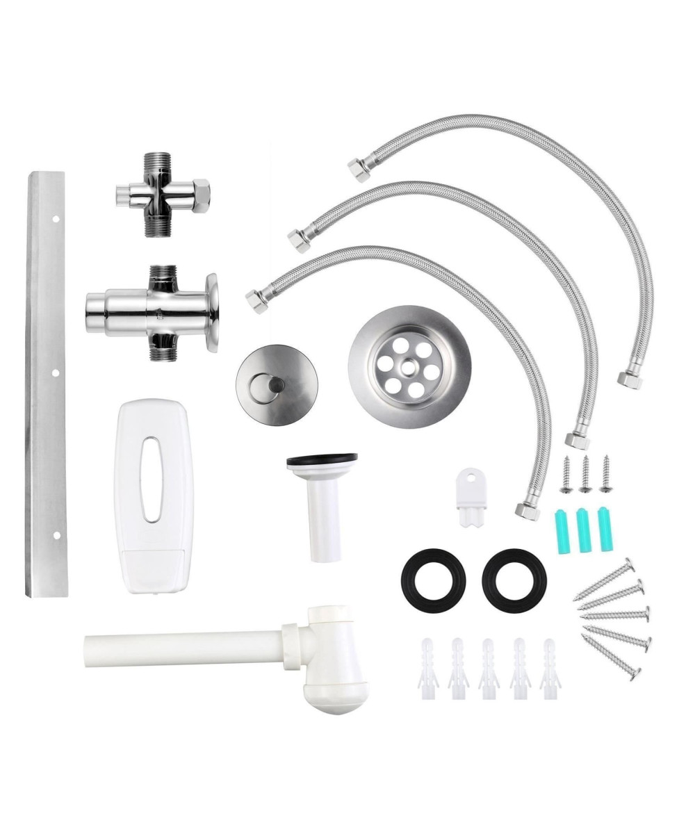 Mit dem Mischventil kann der Kaltwasseranschluss und der Warmwasseranschluss angeschlossen werden. Im Lieferumfang sind alle Teile enthalten, welche zur Montage benötigt werden: Waschbecken, Wasserhahn, Flexschläuche, Mischventil, Siphon, Seifenspender und sämtliches Montagematerial.