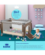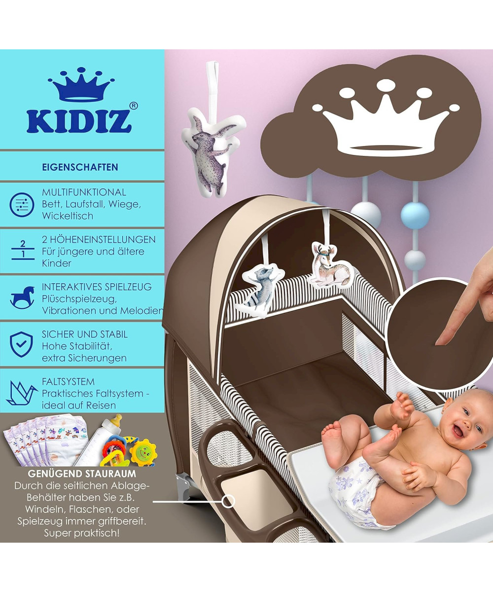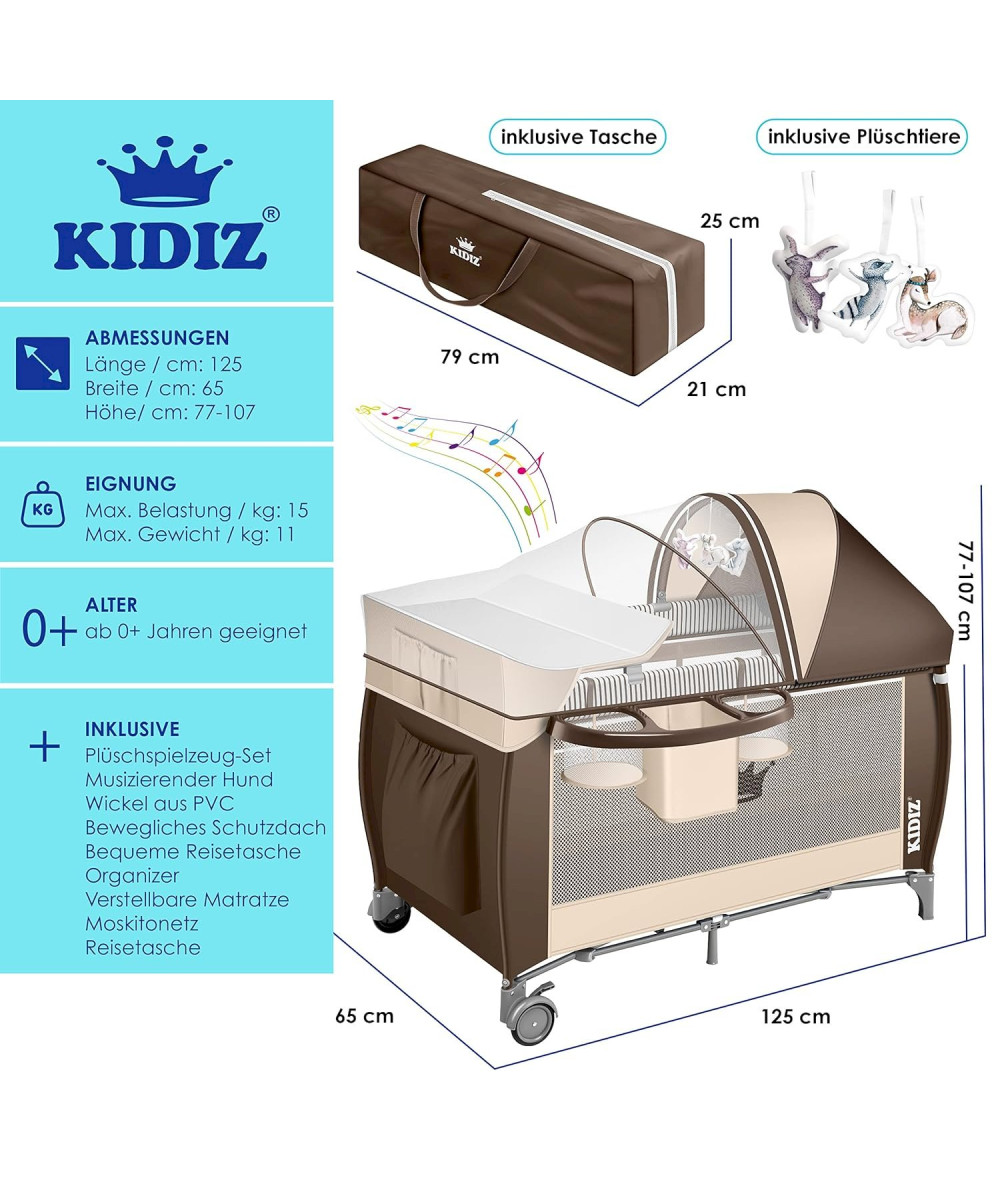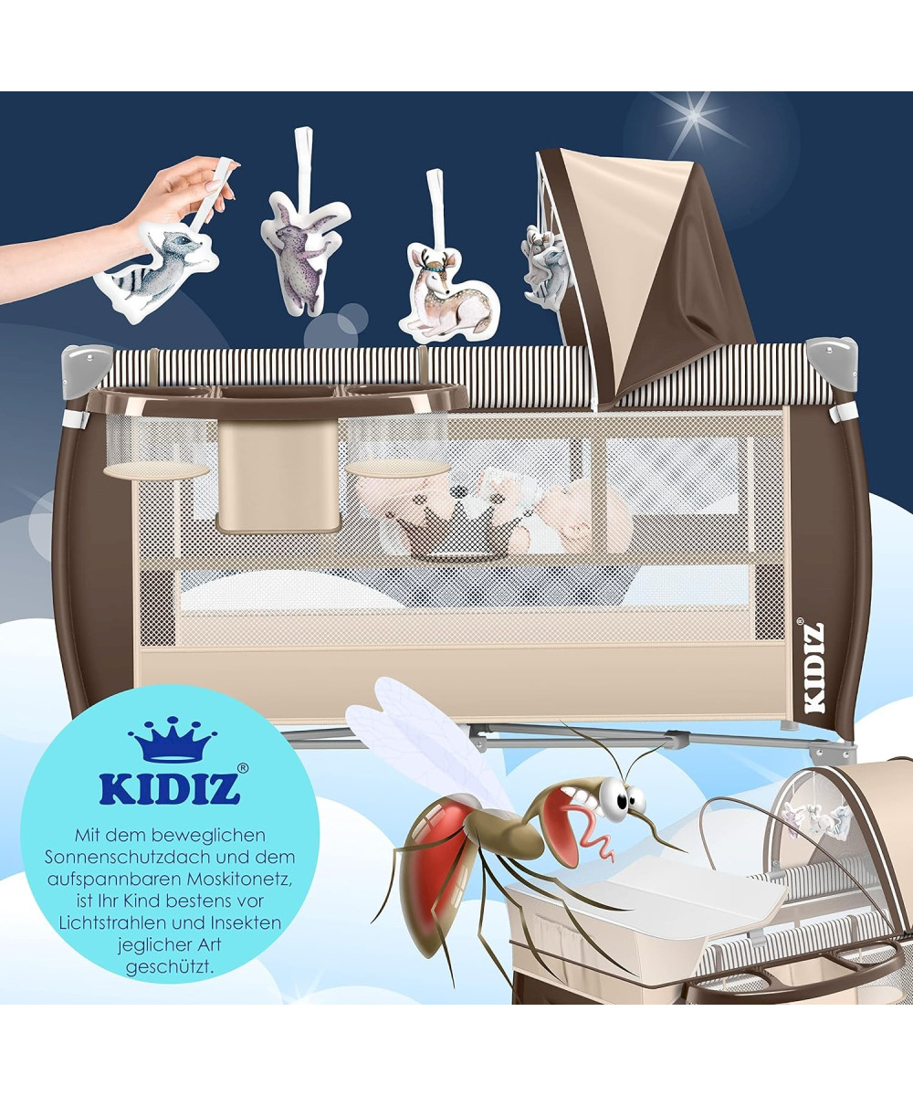 Kidiz lit pour bébé 3 en 1 pliable avec table à langer, moustiquaire et jouets - brun