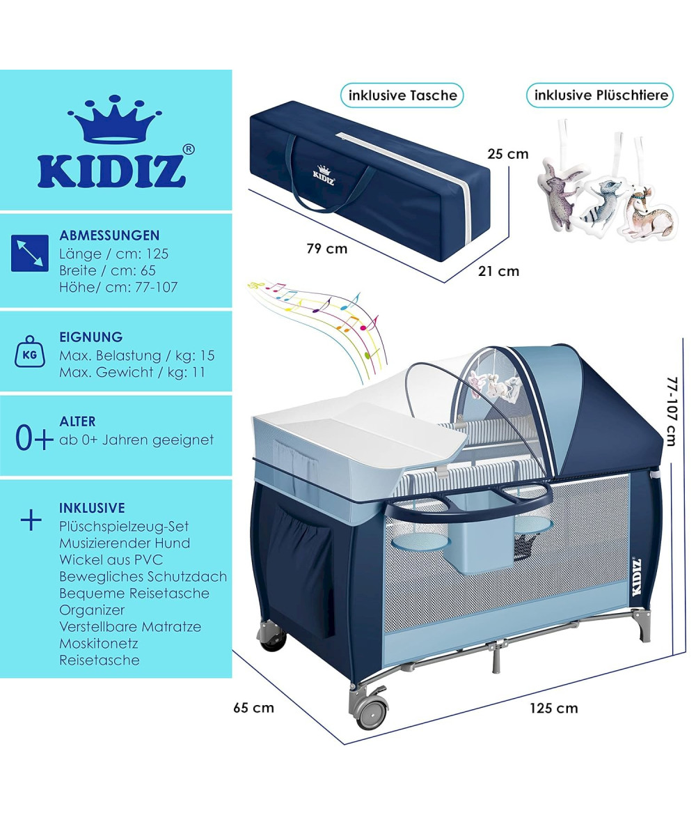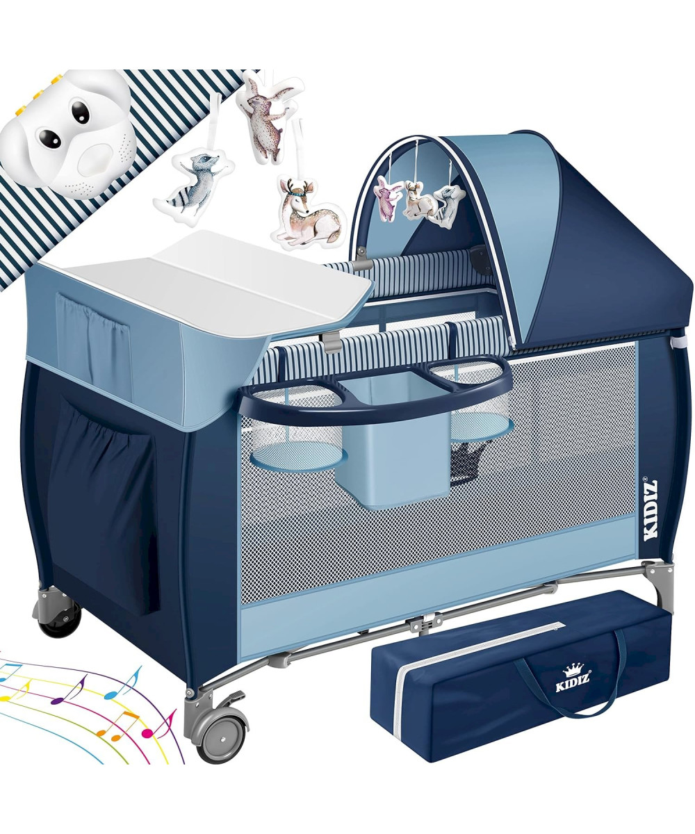 Kidiz lit pour bébé 3 en 1 pliable avec table à langer, moustiquaire et jouets - bleu
