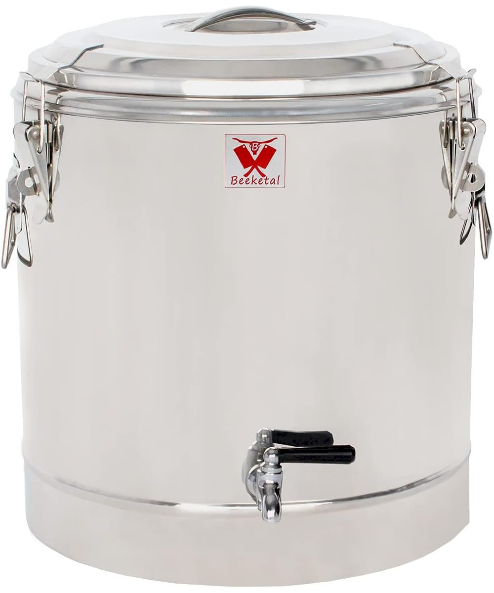 Die Gastro Thermobehälter von Beeketal eignen sich gleichermaßen zum warmhalten oder kalthalten von Speisen oder Getränken. Für eine optimale Isolierung werden die Thermo Behälter aus doppelwandigem Edelstahl gefertigt. Im Deckel ist zudem ein Gummiring eingearbeitet und mit den drei starken Spannverschlüssen wird der Behälter luftdicht, auslaufsicher und somit auch transportsicher verschlossen. Zum transportieren stattet Beeketal die Essensbehälter mit stabilen Metallgriffen an den Seiten aus. Wahlweise können die Behälter mit einem Fassungsvolumen von 11.5, 32 oder 54.5 Litern und mit oder ohne Ablauf-/Zapfhahn bestellt werden.