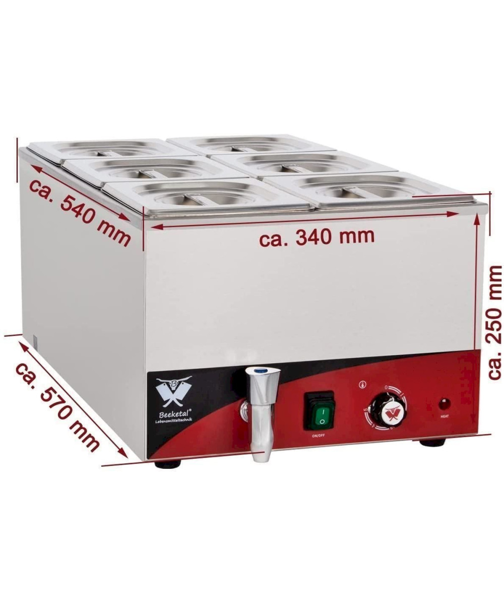 Profi Gastronomie Wasserbad zum Erhitzen und Warmhalten von Speisen aller Art. Speisewärmer im für die Gastronomie typischen Edelstahlgehäuse verfügt über einen Ablasshahn zur leichten Entleerung des Wasserbehälters. Die Temperatur lässt sich genau einstellen (35-65° C). Der große Ablauf mit Siebfunktion und der tiefe Auslauf gewährleisten eine schnelle Entleerung und komfortable Reinigung. Der Beeketal Speisewärmer besticht durch seine einfach jedoch sehr robuste Technik die nahezu unverwüstlich ihre Arbeit verrichtet. Hochwertige und übersichtliche Verarbeitung, stabiler Stand durch das hohe Gewicht und den zuverlässigen Anti-Rutsch Gummifüßen, machen die Beeketal Bain Marie Speisewärmer nahezu unverzichtbar für die anspruchsvolle Profi Gastronomie.