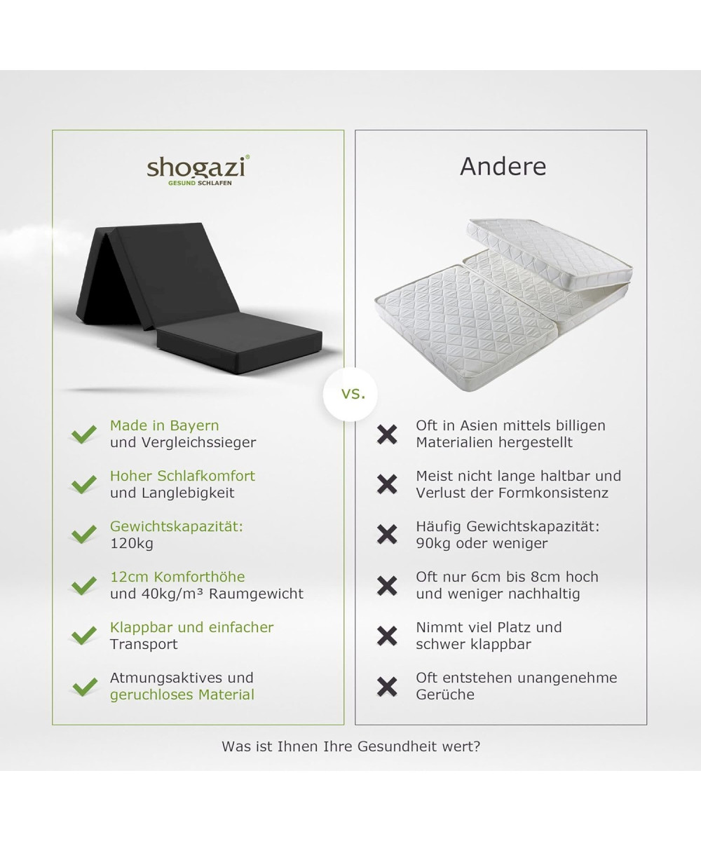 - Durable : les matelas pliants SHOGAZI sont faciles à manipuler et rapides à monter et à démonter. Ils peuvent être facilement rangés et ne prennent pas beaucoup de place. Notre matelas pliable est équipé d'un noyau en mousse froide de qualité supérieure qui assure une excellente qualité de couchage. La housse est très résistante à la déchirure, durable et facile d'entretien, afin de garantir une ouverture et une fermeture durables