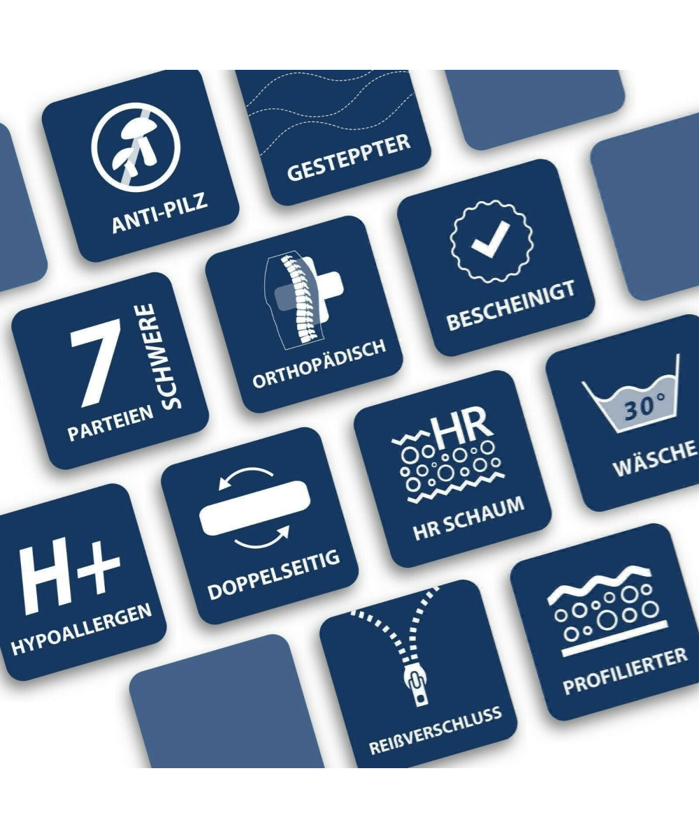 Matratzenbezug abnehmbarer und waschbar, strapazierfähiger und hautsympathischer Oberstoff mit atmungsaktiven Klimafasern versteppt.
