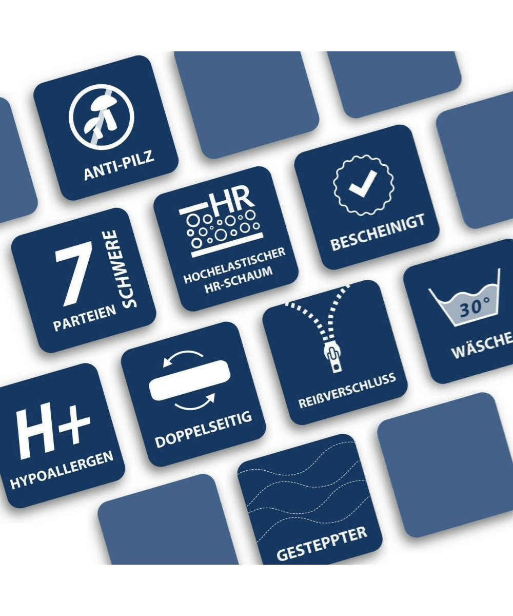 Matratzenbezug abnehmbarer und waschbar, strapazierfähiger und hautsympathischer Oberstoff mit atmungsaktiven Klimafasern versteppt.
