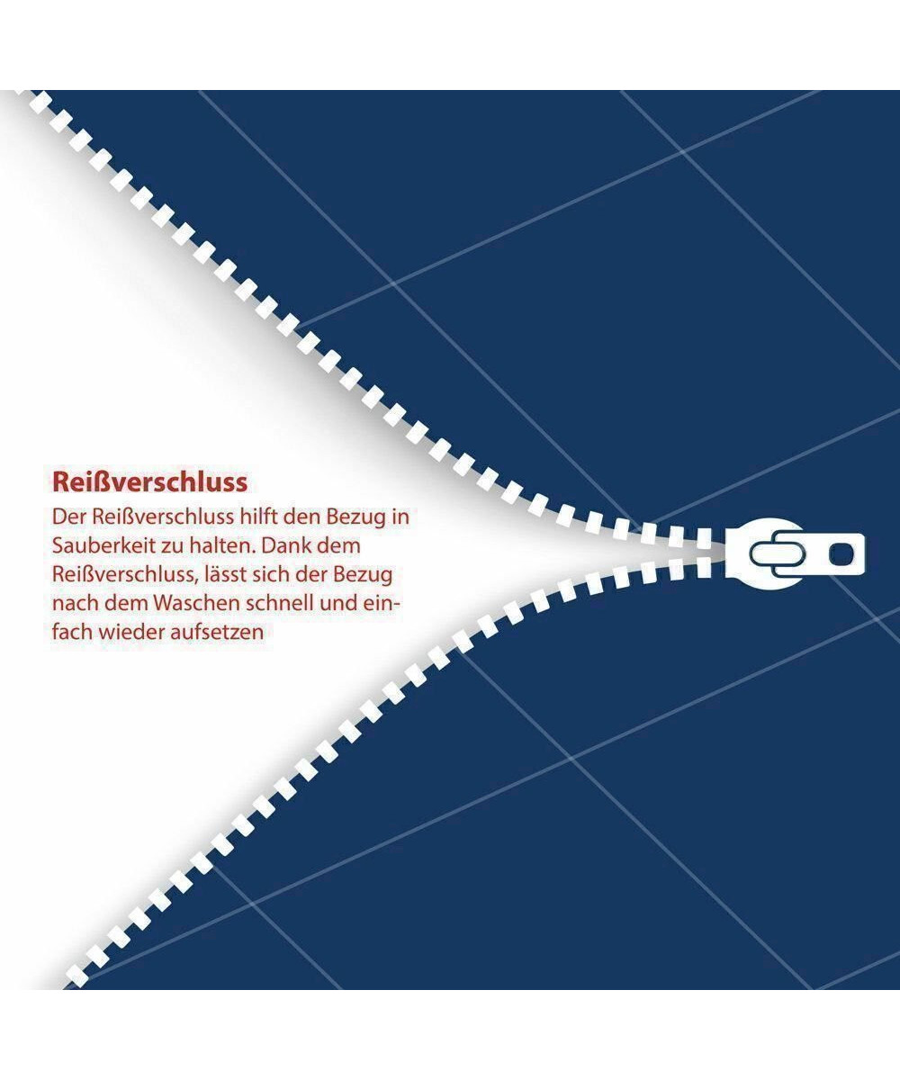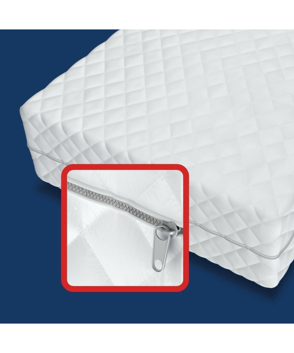 hergestellt aus antiallergischen Materialien mit Membranstruktur. Der Bezug ist mit einem Reißverschluß versehen, abnehmbar und waschbar. Bietet ein Höchstmaß an Frische und Hygiene. Oberstoff aus atmungsaktivem 100% Polyester Mikrofaser 80g/m2 versteppt mit 100% Polyester Klimafasern 120g/m2 und Vlieseline 15g/m2.