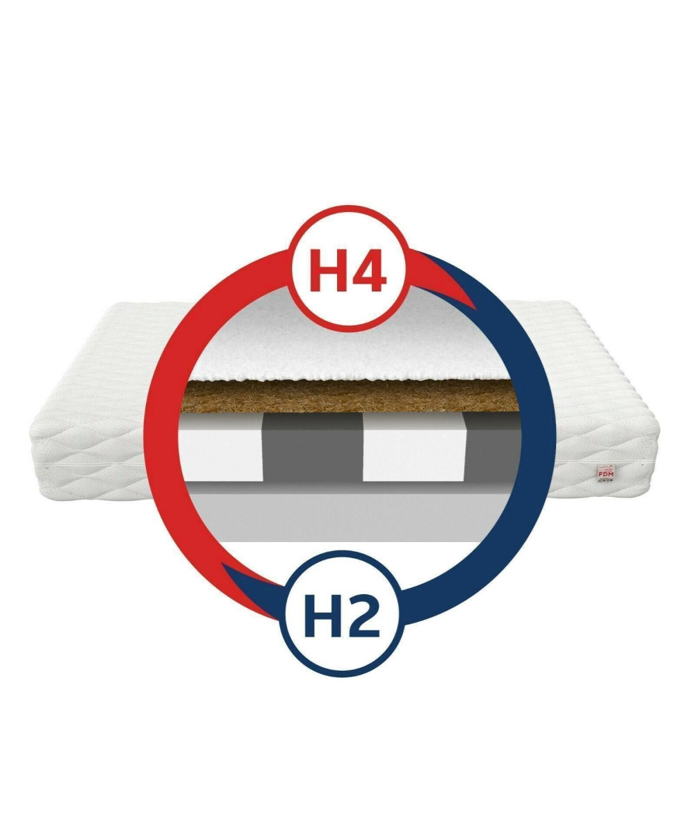 Aufgrund des unterschiedlichen Aufbaus besitzt die Matratze zwei Härtegrade. Wie auf der Abbildung zu sehen hat die obere Liegefläche Härtegrad 4, die untere Liegefläche Härtegrad 2