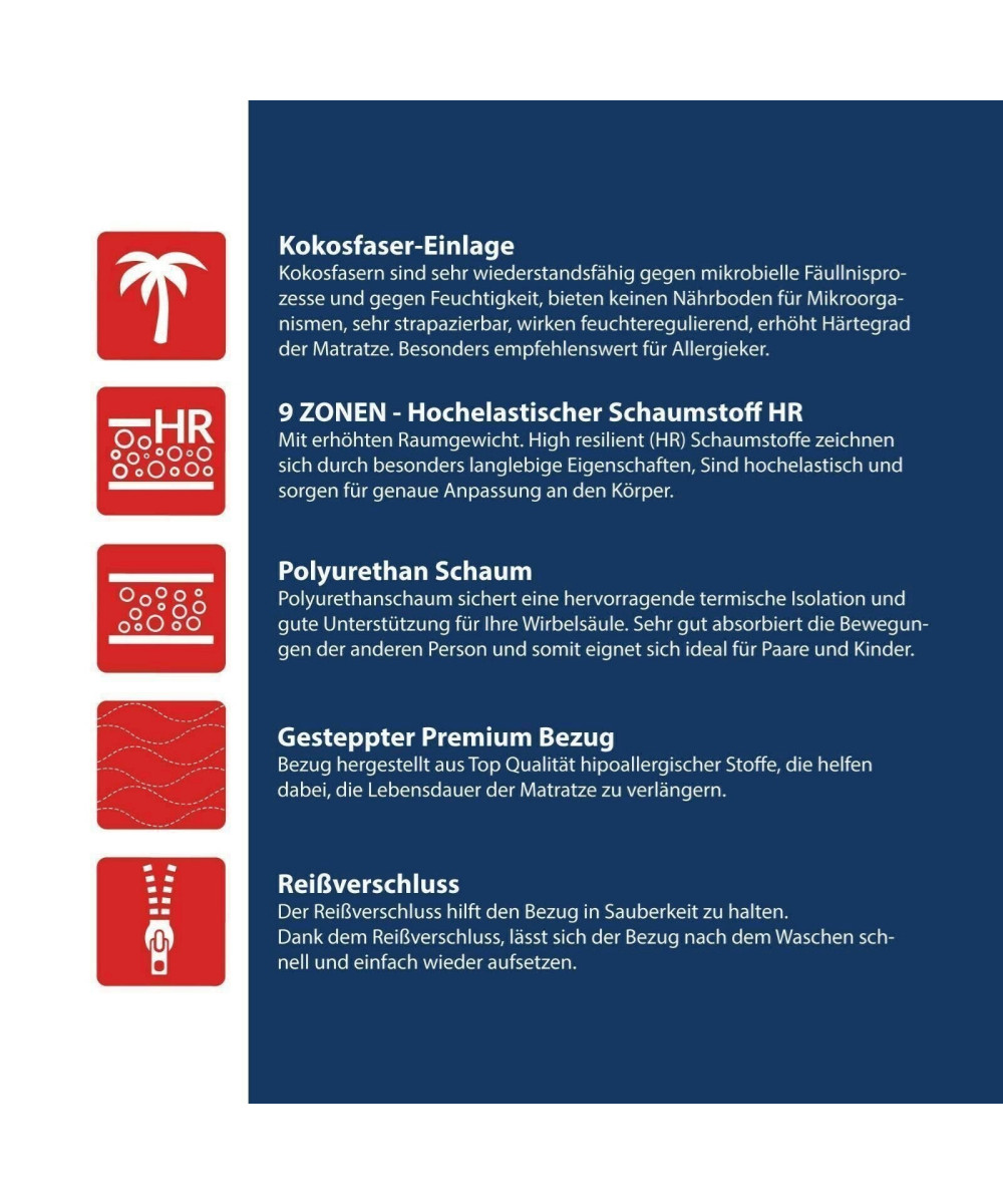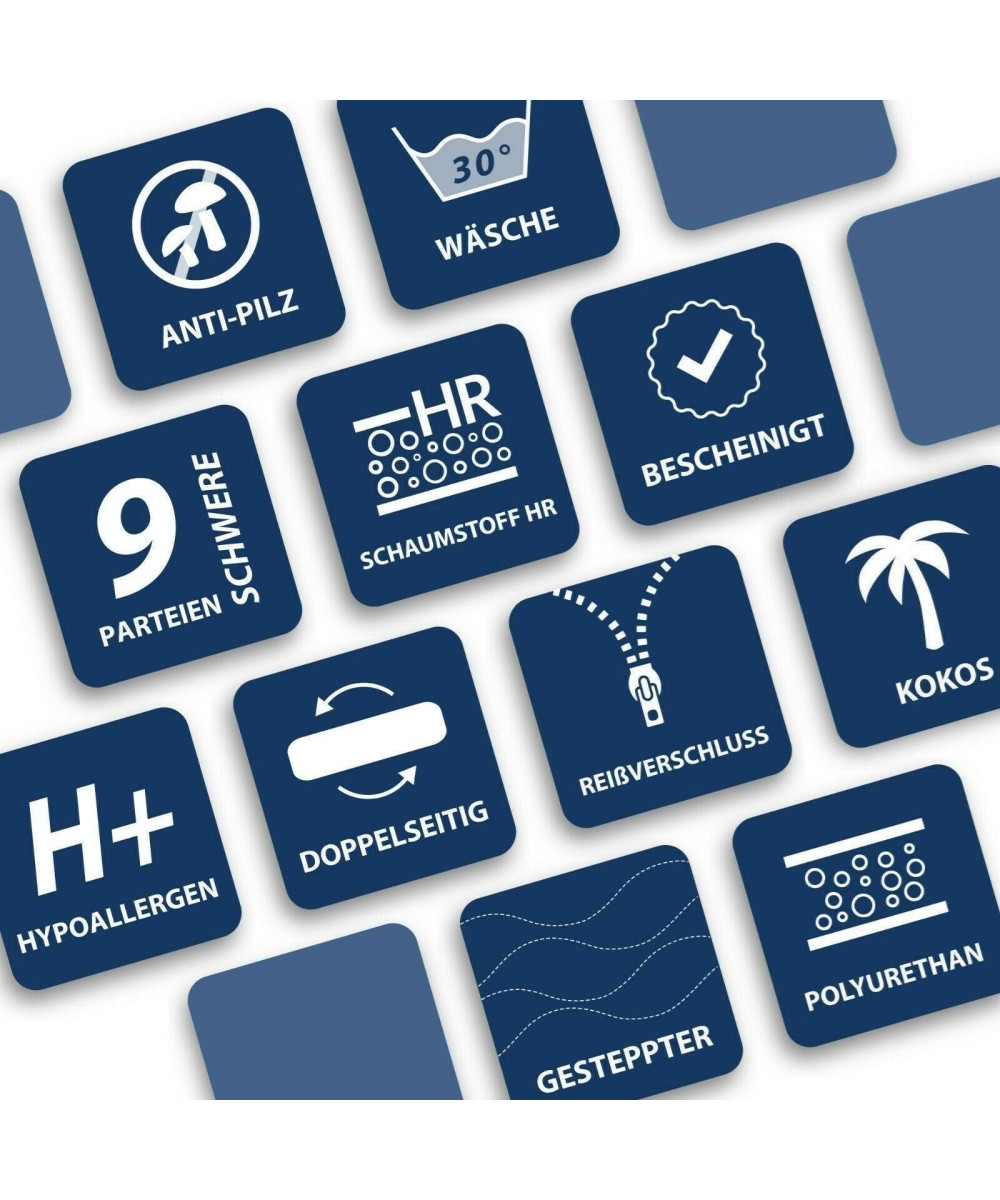 9-Zonen Premium HR-Kaltschaumkern (High Resilent = hochelastisch) mit guter ergonomischer Anpassung und hoher Punktelastizität. Ein weiterer Vorteil der 9 Zonen ist die optimale Anpassung an die Schlafposition. Dadurch wird der Rücken sehr gut unterstützt und es wird somit Rückenschmerzen vorgebeugt.