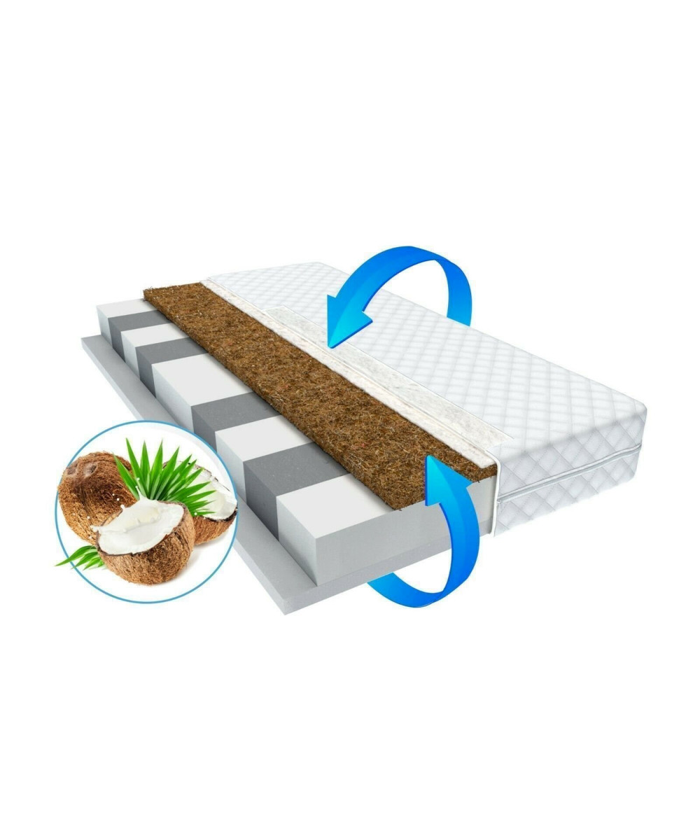 In diesem Modell wurde unter anderem auch Kokosfaser verwendet. Kokosfaser gehört zu den zähesten natürlichen Rohstoffen und besitzt antiallergische und Anti-Pilz Eigenschaften. Die Kokosfasern sind leicht und sehr luftig, daher verbessert sich die Luftzirkulation im Inneren der Matratze. Die Verwendung von Kokosfasern versteift die Matratze.