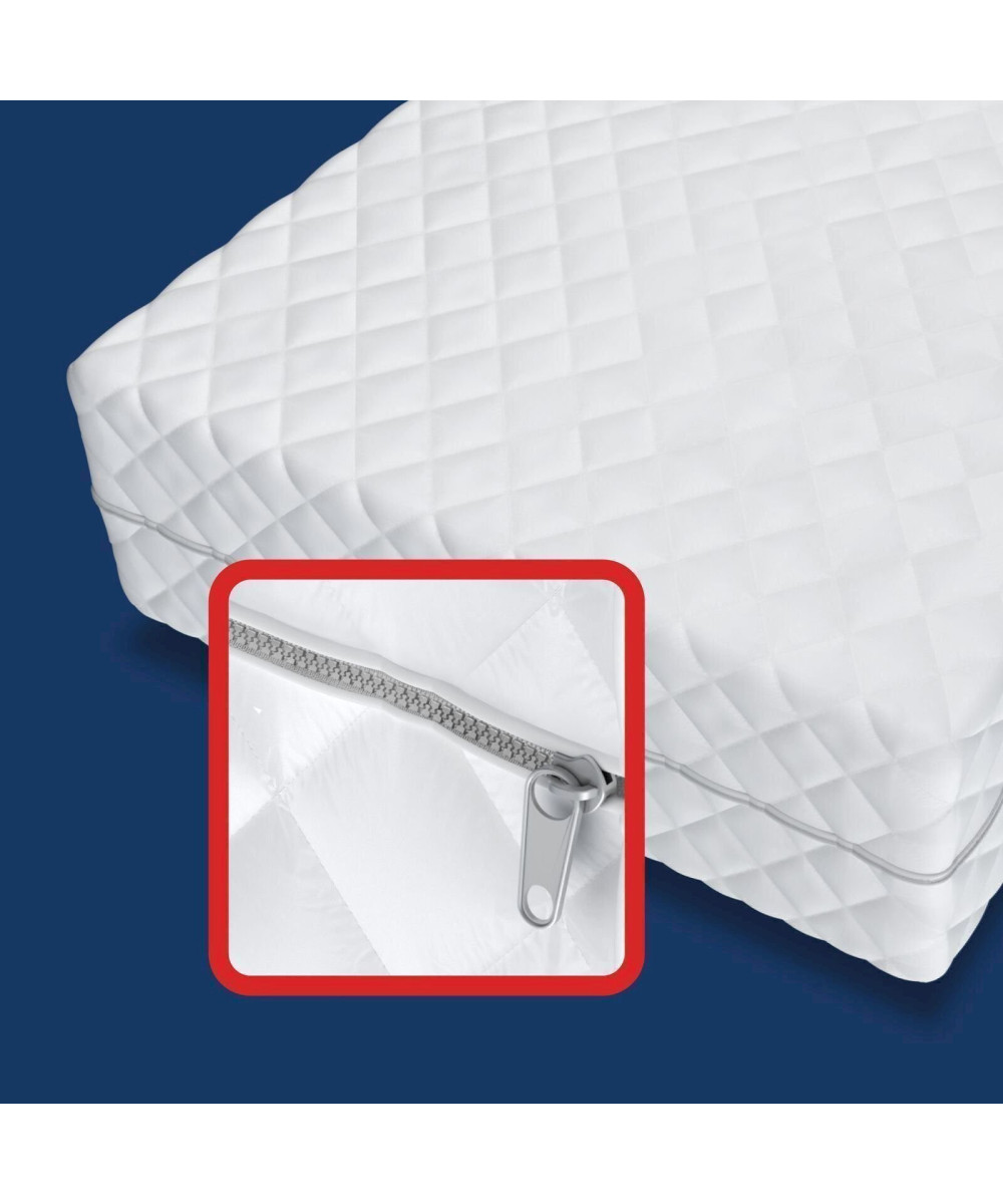 hergestellt aus antiallergischen Materialien mit Membranstruktur. Der Bezug ist mit einem Reißverschluß versehen, abnehmbar und waschbar. Bietet ein Höchstmaß an Frische und Hygiene. Oberstoff aus atmungsaktivem 100% Polyester Mikrofaser 80g/m versteppt mit 100% Polyester Klimafasern 120g/m und Vlieseline 15g/m.