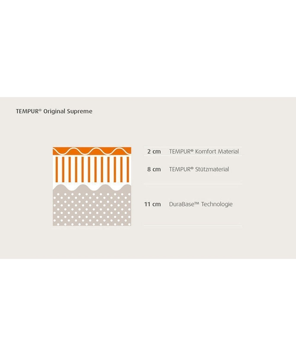Die Tempur-Original-Supreme-Matratze wird darüber hinaus in weiteren Ausführungen angeboten. Elite 25 cm und Luxe 30 cm Höhe. Schauen wir uns den Aufbau der Matratze an: Sie besteht aus einem dreischichtigen, druckentlastenden Matratzenkern. Auf eine 11 cm dicke, robuste Trägerschicht aus DuraBase Technologie folgt die 8 cm Stütz-Schicht. Den Aufbau krönt die 2 cm dicke Komfort-Schicht. Durch ihre zusätzliche Unterstützung und Druckentlastung ist ein komfortabler Schlaf garantiert. Es ergibt sich ein fester Liegekomfort für erholsame Nächte.