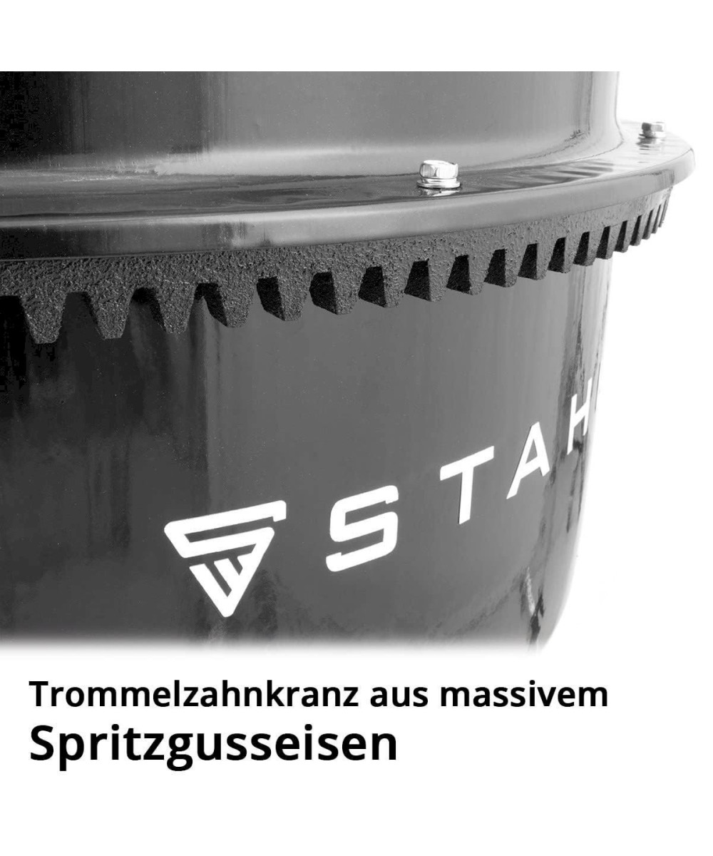 La puissante bétonnière STAHLWERK convient au malaxage professionnel de différents matériaux de construction. Un moteur puissant de 600 watts à forte puissance de traction mélange de manière fiable tous les types de matériaux de construction en poudre et liquides tels que le béton, le ciment, le mortier, la chape, le plâtre et autres produits de mélange à une vitesse de rotation de 27 tr/min. Le grand tambour pivotant à 360 degrés, d'une capacité de 140 litres, assure une répartition uniforme des matériaux à mélanger. Une roue basculante pratique et une pédale intégrée permettent de bloquer facilement le tambour dans la position souhaitée. La couronne du tambour de haute qualité est fabriquée en fonte injectée massive et est entraînée par une roue dentée métallique. Le châssis en acier résistant à la torsion et au basculement confère à la bétonnière une grande stabilité. L'utilisation de composants de haute qualité garantit une durée de vie élevée et une longue durée de vie. Grâce à ses pneus robustes en caoutchouc au profil antidérapant et à ses dimensions compactes, le malaxeur à ciment est facile à transporter. Le malaxeur à mortier est idéal pour une utilisation professionnelle sur les chantiers ainsi que pour le bricolage et le jardinage.