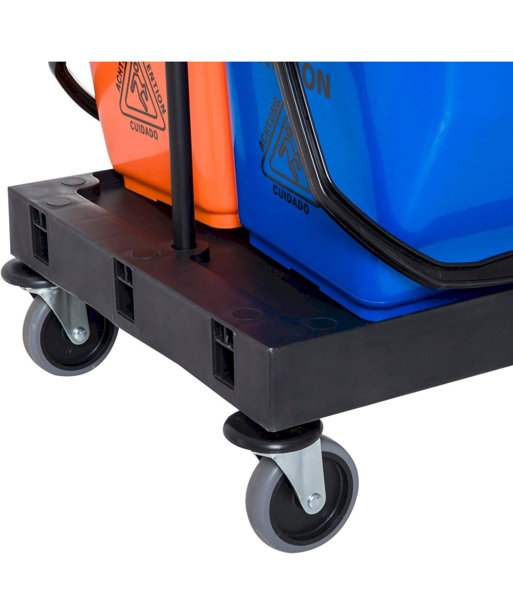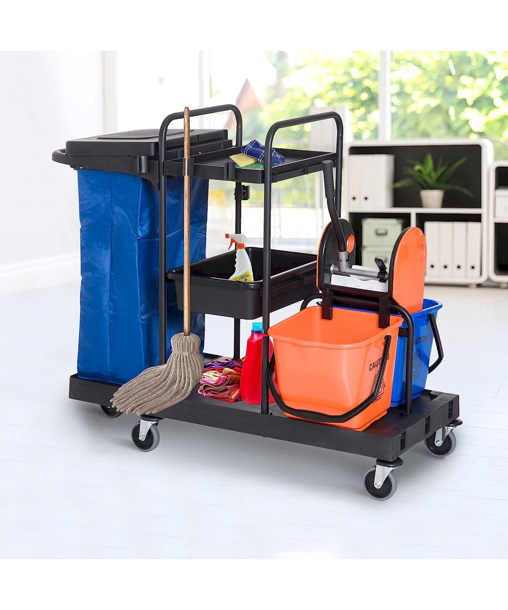 Der Profi-Reinigungswagen von HOMCOM wird Ihnen die Arbeit um einiges erleichtern. Er eignet sich bestens für die Flächenreinigung in Hotels, Krankenhäusern oder Büros. Der Putzwagen besteht aus robustem Kunststoff und verfügt über vier leichtgängige Rollen, zwei Ablagen sowie einen Abfallsack mit großem Fassungsvermögen. Zur Ausstattung gehören auch zwei verschiedenfarbige Eimer mit abnehmbarer Auswringvorrichtung – damit Ihnen die Arbeit noch leichter und sauberer von der Hand geht.