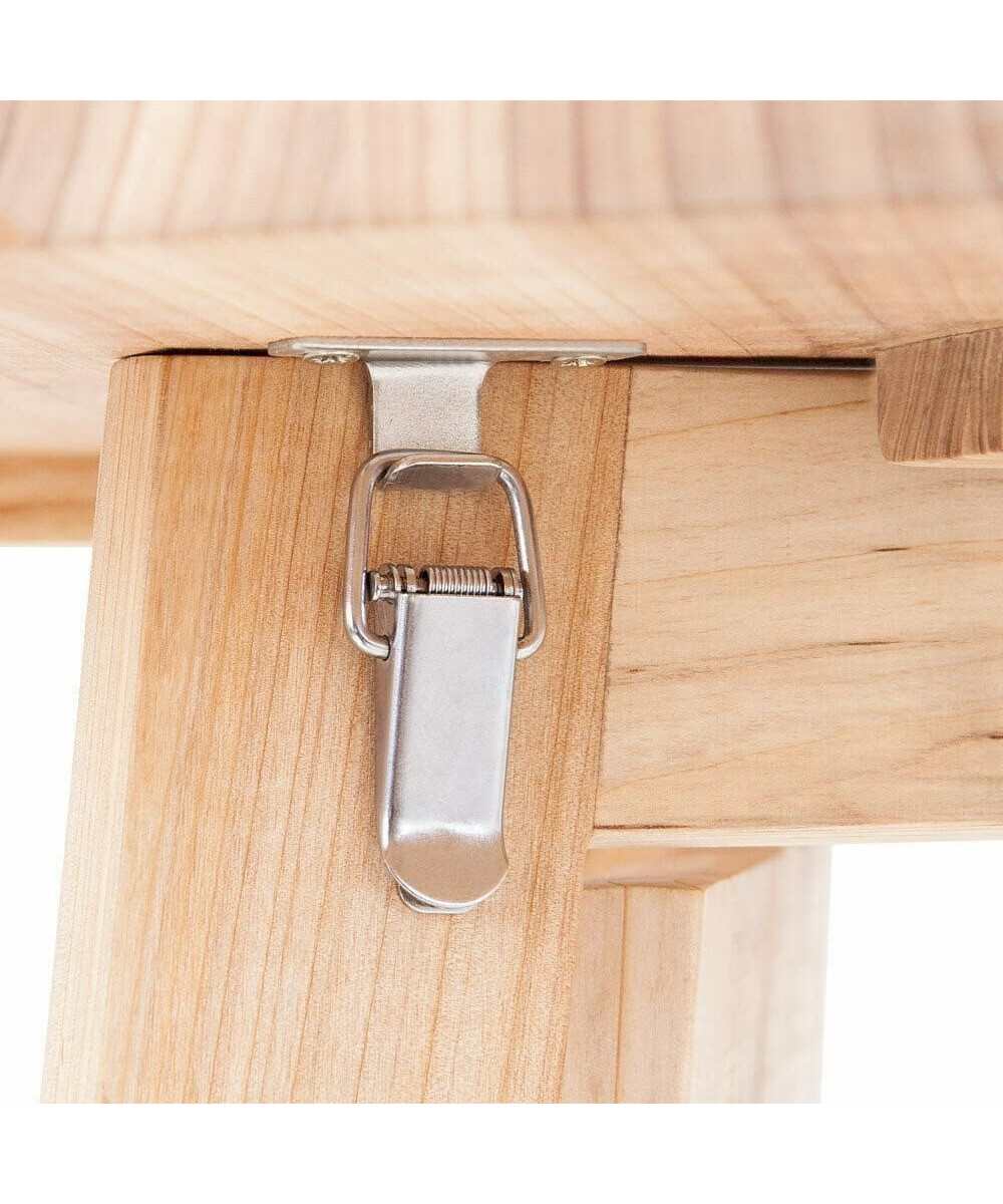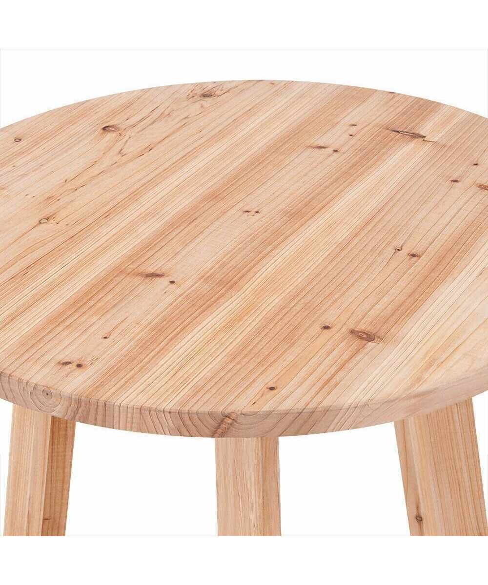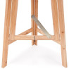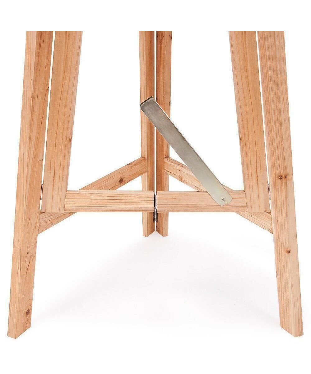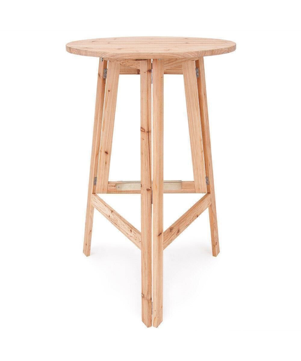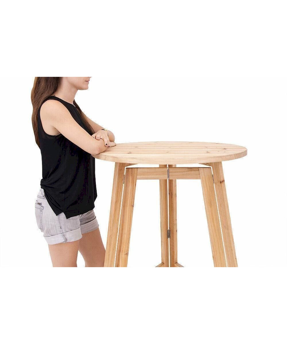 La table haute pliable en bois massif naturel dispose d'un plateau rond de 78 cm de diamètre et d'une épaisseur de 27 mm. La structure est faite de trois pieds. Les pieds sont pliables les uns dans les autres et le plateau est rabattu sur le côté. Un rail en métal sur la structure des pieds assure une position stable.