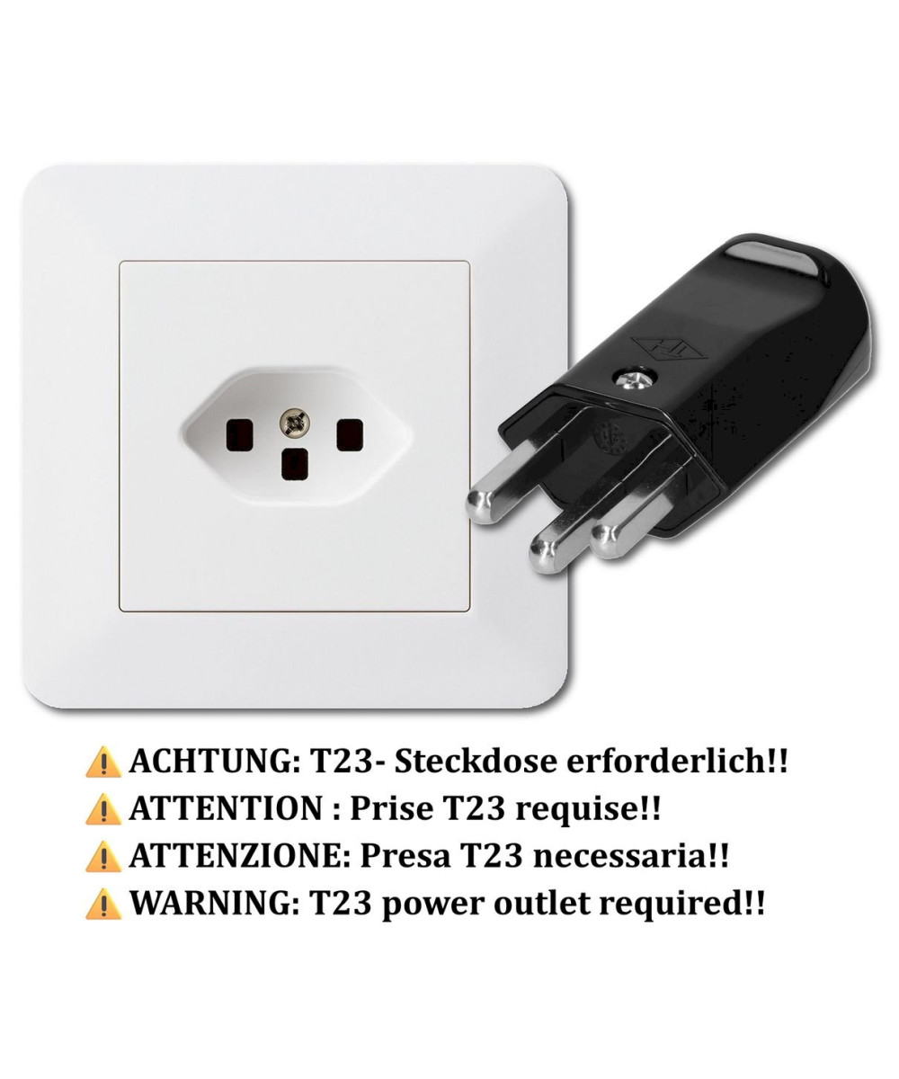 Pour utiliser ce produit, un socle électrique suisse T23 16A avec trous carrés est exigée (ce produit possède une fiche allemande, mais un Fix-adapter suisse T23 16A est inclus dans l'emballage).