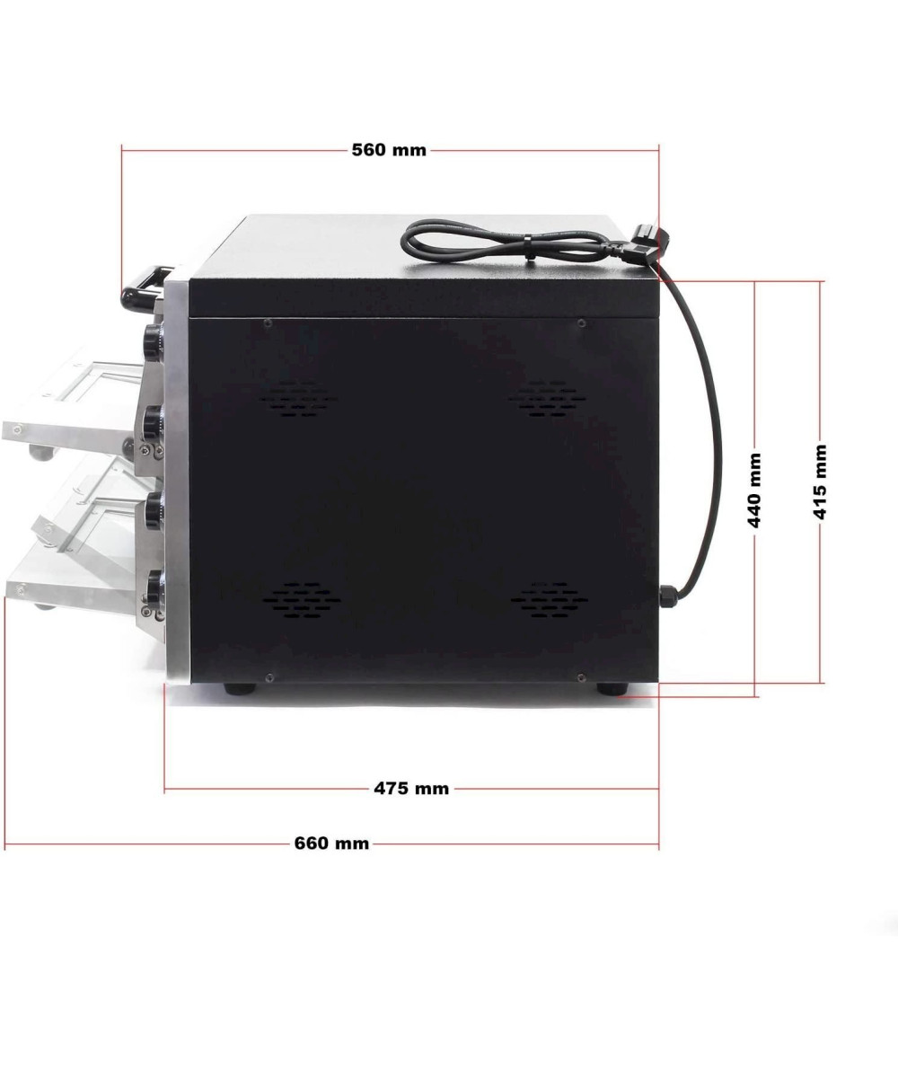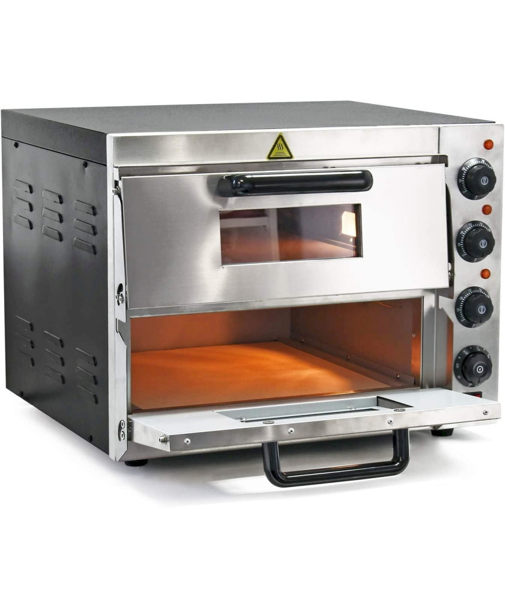 Le four à pizza a un boîtier noir et une façade en acier inoxydable. Le four est ainsi facile à nettoyer. Grâce au traitement de matériaux résistants à la chaleur et à la rouille, le four est non seulement robuste, mais garantit également une longue durée de vie.