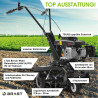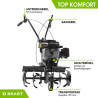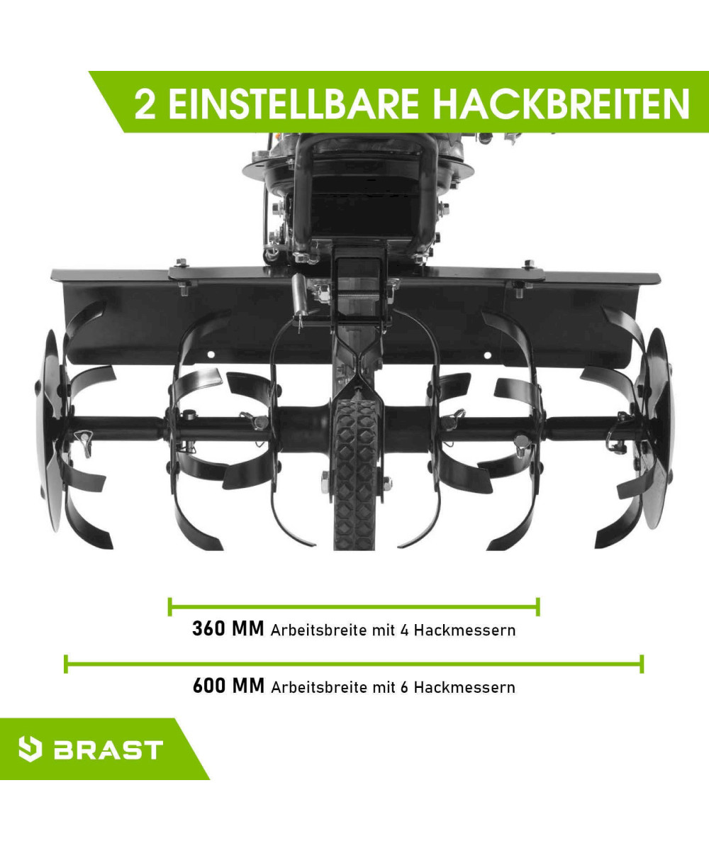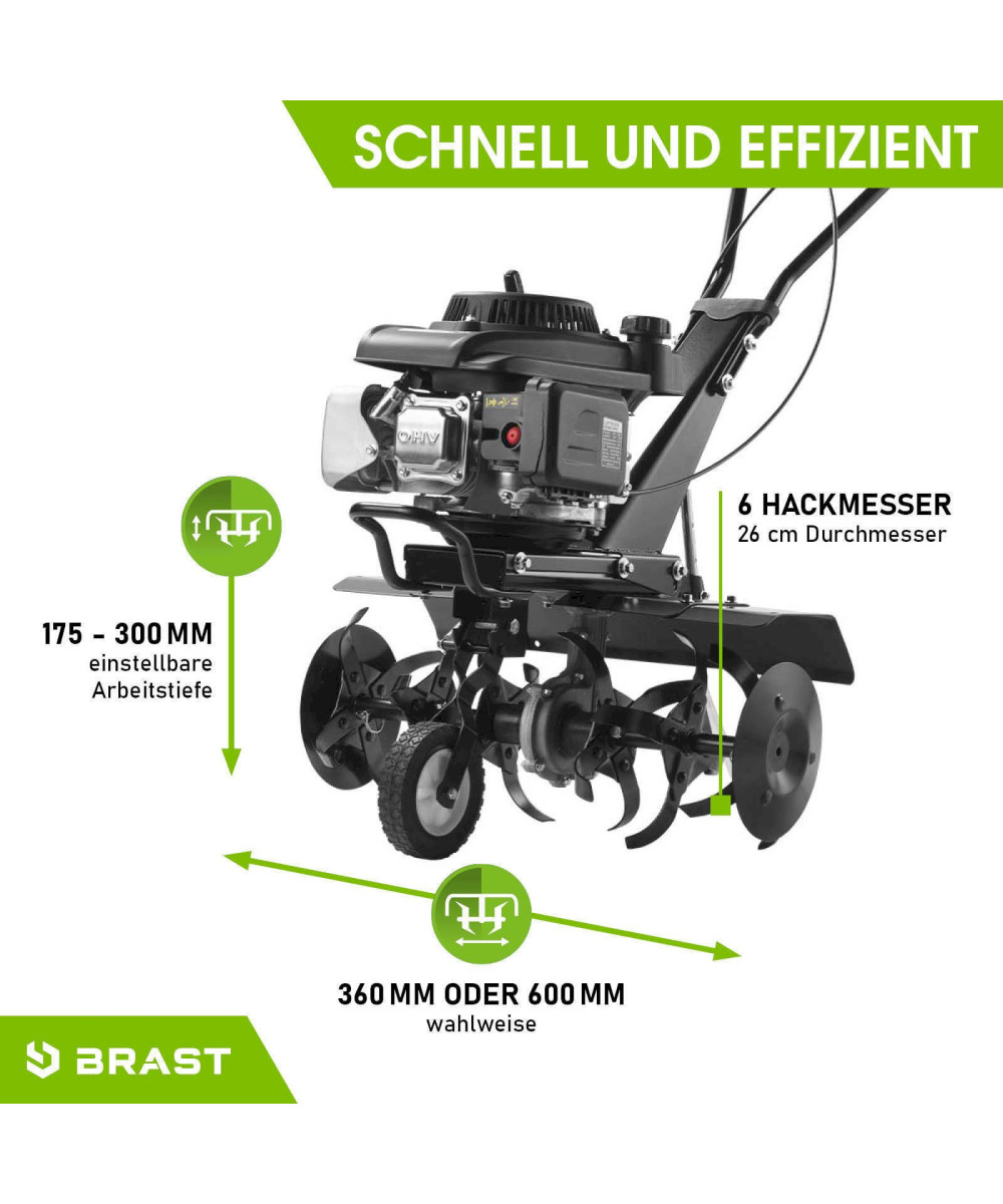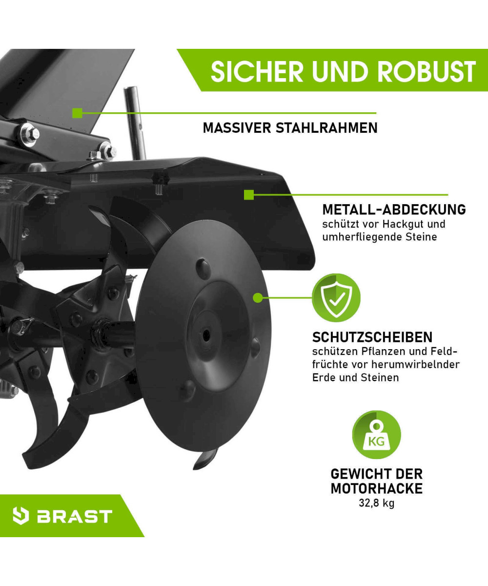 La motobineuse BRAST a un châssis en acier solide et, avec ses 32,8 kg environ, est sûre et robuste pour la surface à travailler. La carrosserie de haute qualité vous protège des débris de bois et des pierres volantes. Un appareil optimal pour le décollement du sol, la préparation des semences, le désherbage ainsi que pour le mélange de matériaux déchiquetés, d'engrais et de tourbe