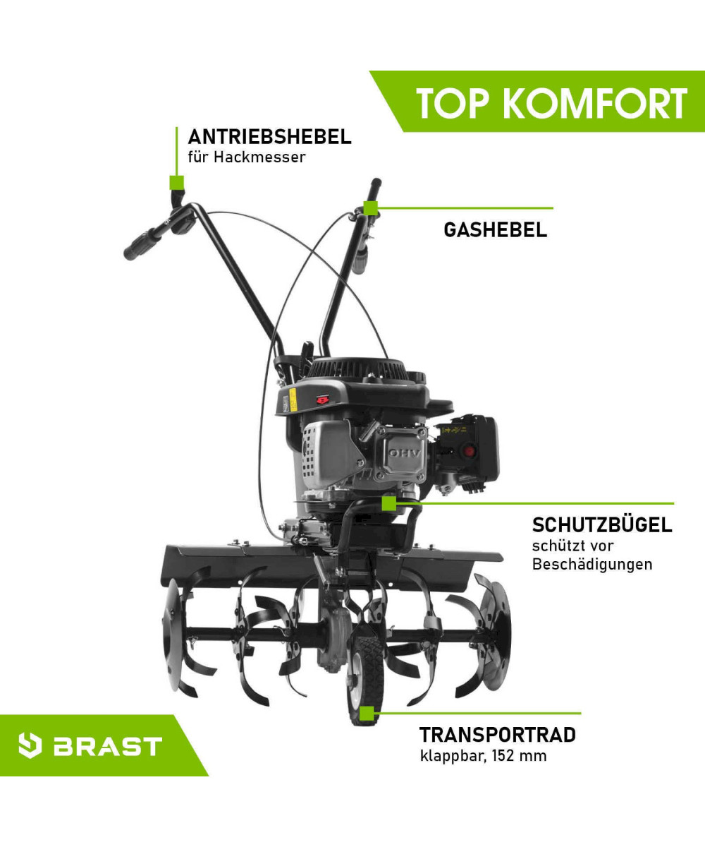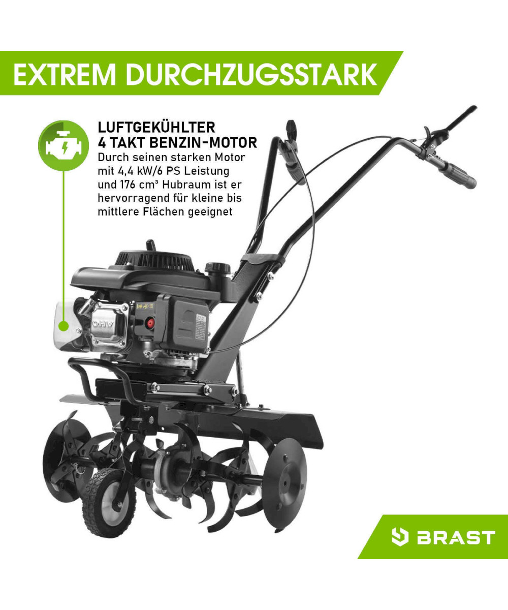 Le bestseller BRAST testé par le TÜV et doté d'un moteur encore plus puissant : le moteur à essence BR 55 AF5000 combine puissance de traction, maniabilité, efficacité et sécurité : le moteur 4 temps de 176 cm3 de cylindrée, avec une puissance maximale de 4,4 kW (6), est extrêmement solide et donc idéal pour les moyennes et grandes surfaces.