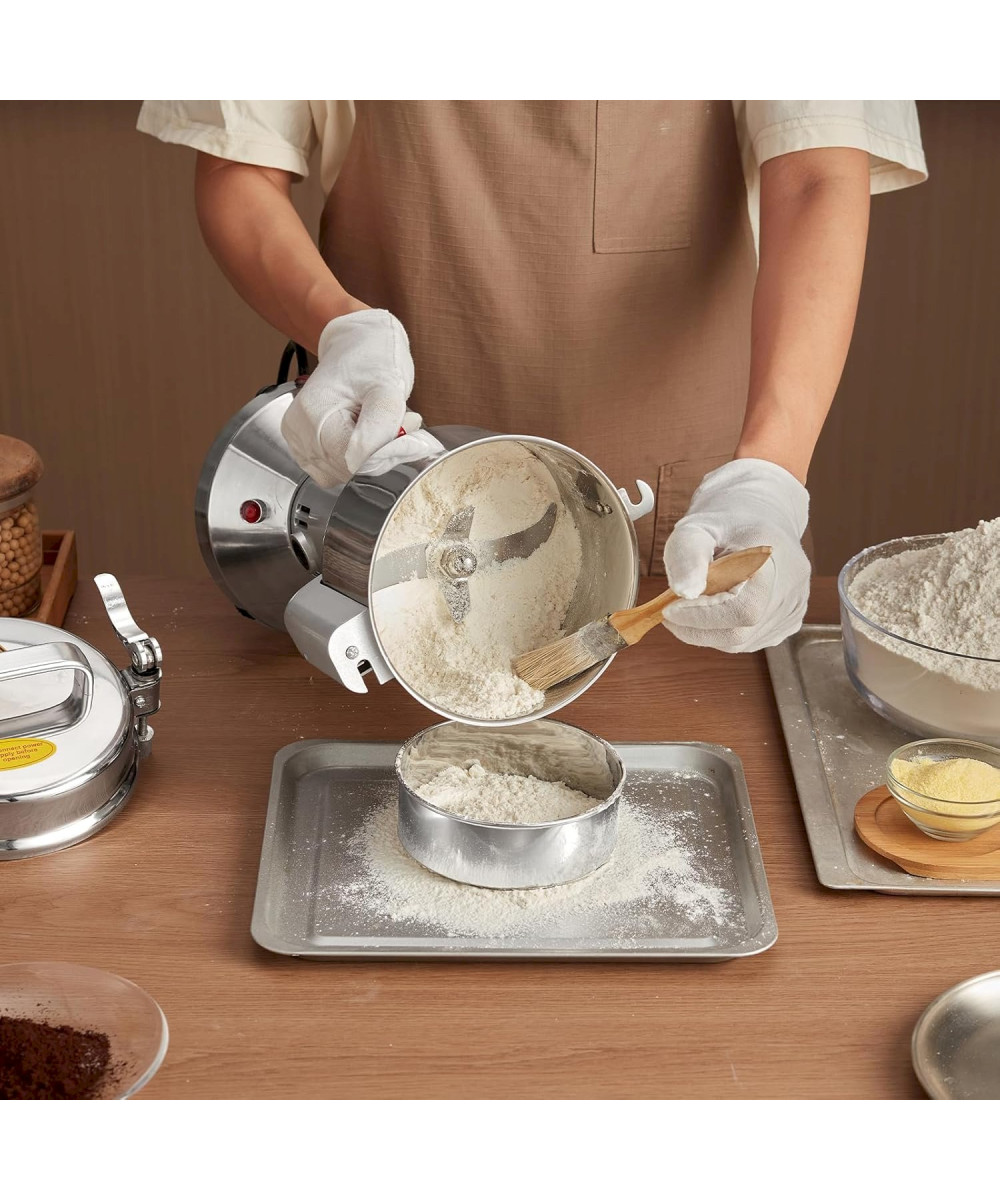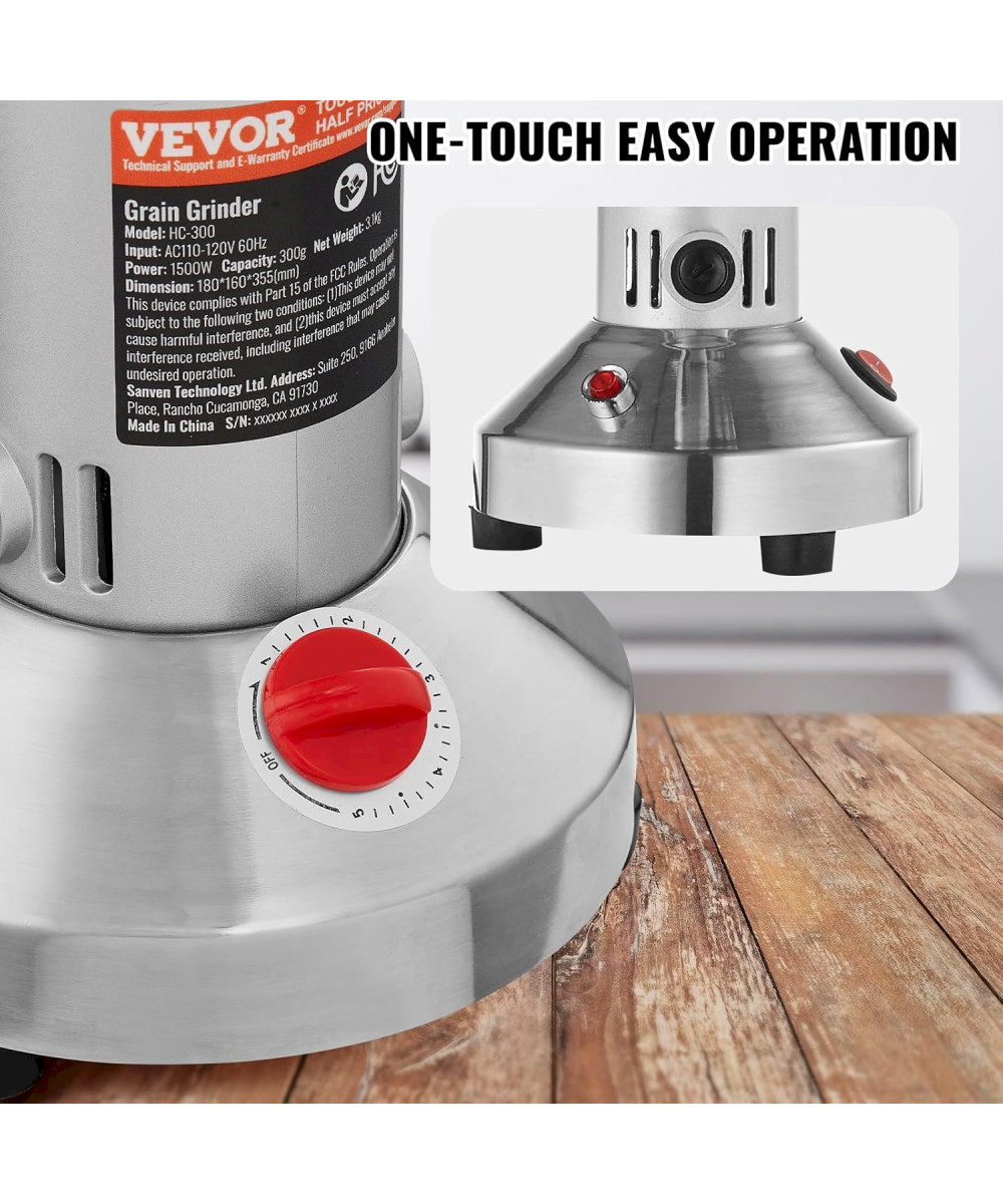 Conceptions de sécurité améliorées : le moulin à grains de blé s'arrête automatiquement lorsque le couvercle est ouvert, ce qui améliore la sécurité et protège l'utilisateur contre les blessures. Lorsque le moulin à grains est surchargé, le protecteur de surcharge fonctionnera automatiquement pour contrôler le fonctionnement. De plus, le moulin à poudre est facile à utiliser avec une minuterie de 0 à 5 minutes.