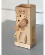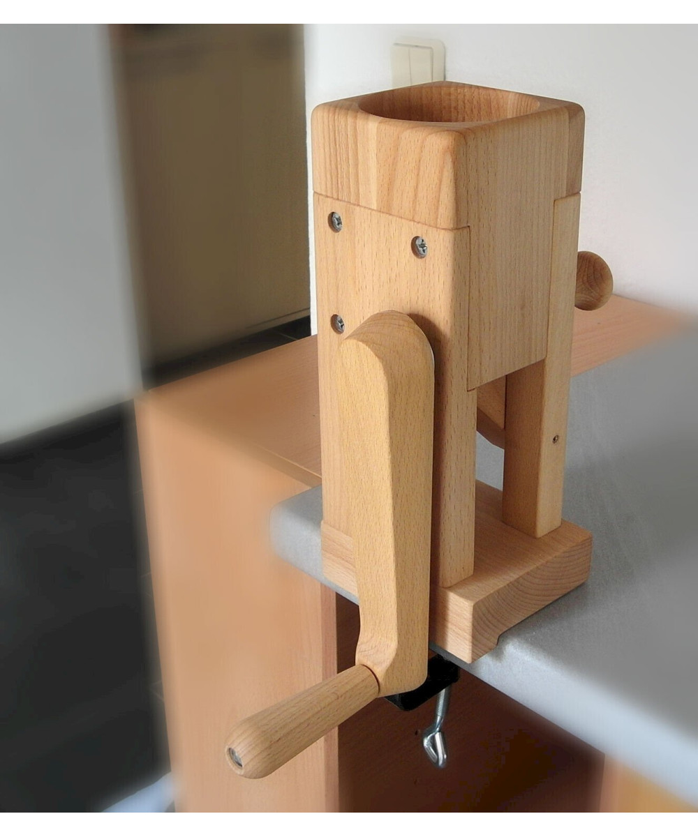 Das stabile Holzgehäuse aus massiver Buche, leicht geölt, beherbergt im Inneren zwei unverwüstliche Stahlwalzen. Die Feinheit der Flocke lässt sich durch den Verstellhebel minimal in drei Stufen (fein, mittel und grob) einstellen.