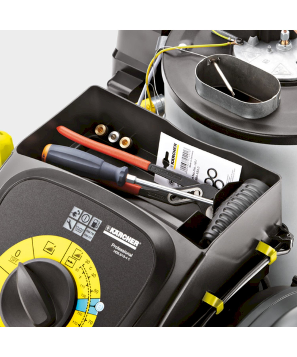 Le HDS 8/18-4 C est le nettoyeur haute pression à eau chaude le plus puissant de notre gamme HDS Compact. Ce nettoyeur triphasée, équipé d'un moteur électrique 4 pôles refroidi à l'eau, est facile à utiliser. Il est ergomique, économique et respecte l'environnement. Son bouton de commanque unique permet un fonctionnement intuitif. Ses grandes roues et sa roue avant de direction lui offrent une très grande maniabilité. Alors que la poignée-pistolet EASY!Force utilise la force de recul du jet haute pression pour réduire la force de maintien à zéro, les connexions rapides EASY!Lock permettent une manipulation cinq fois plus rapide qu'avec les raccords conventionnels. Le robuste châssis assure une sécurité optimale, car les réservoirs de détergent et de carburant sont intégrés de manière sécurisée. Des compartiments de rangement pratiques pour accessoires et outils complètent la vaste gammede fonctionnalités offertes par le HDS 8/18-4 C.