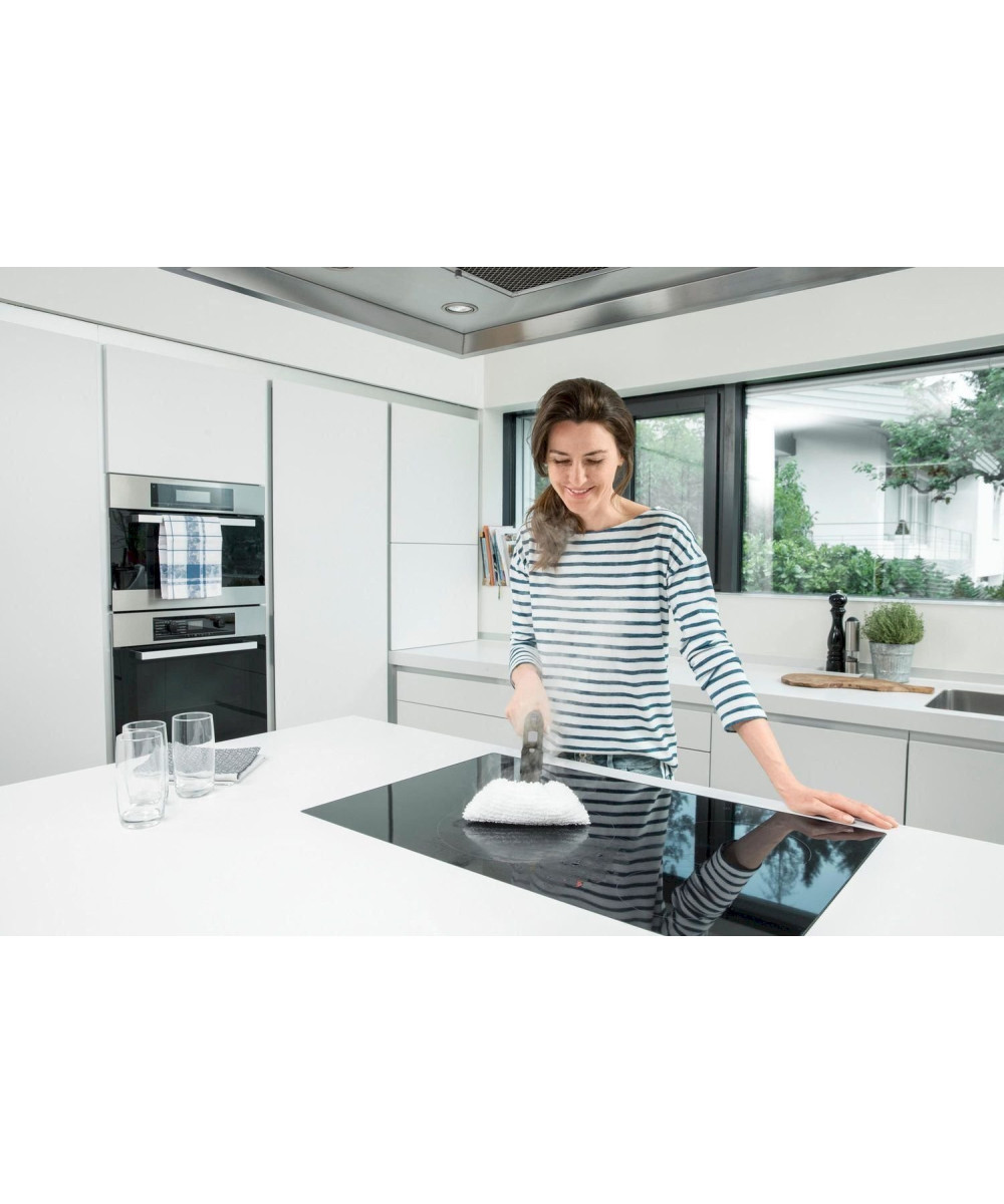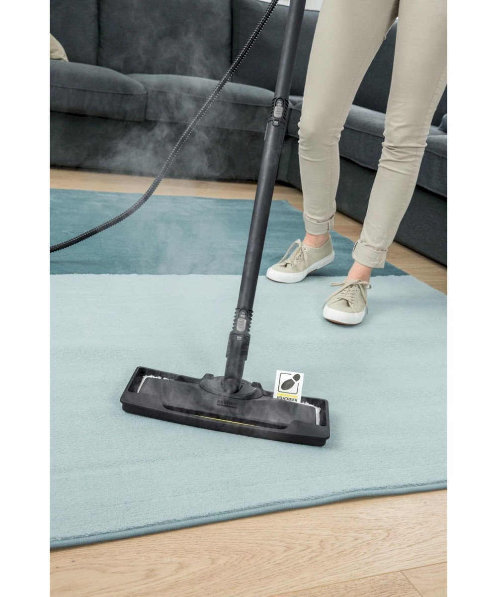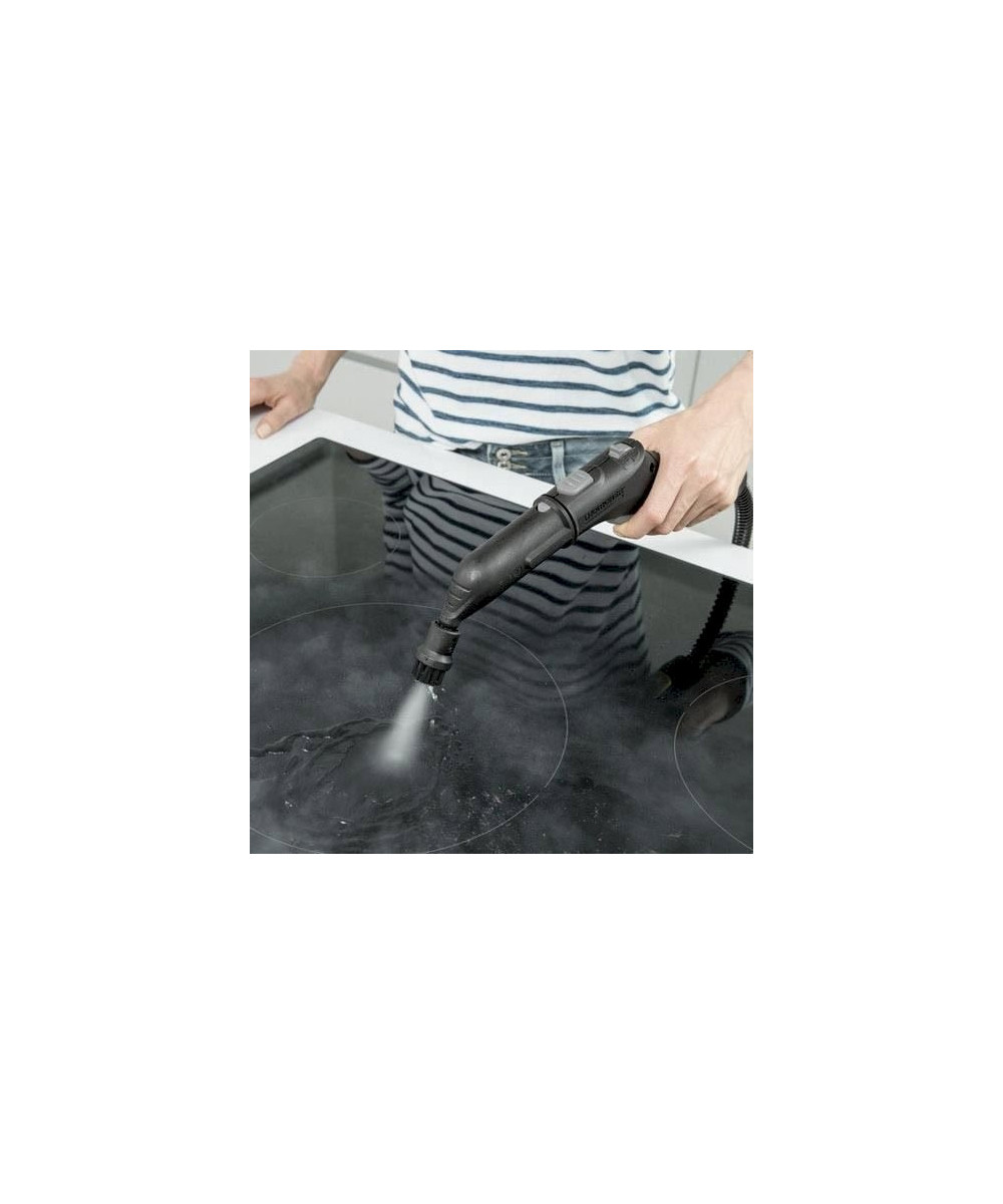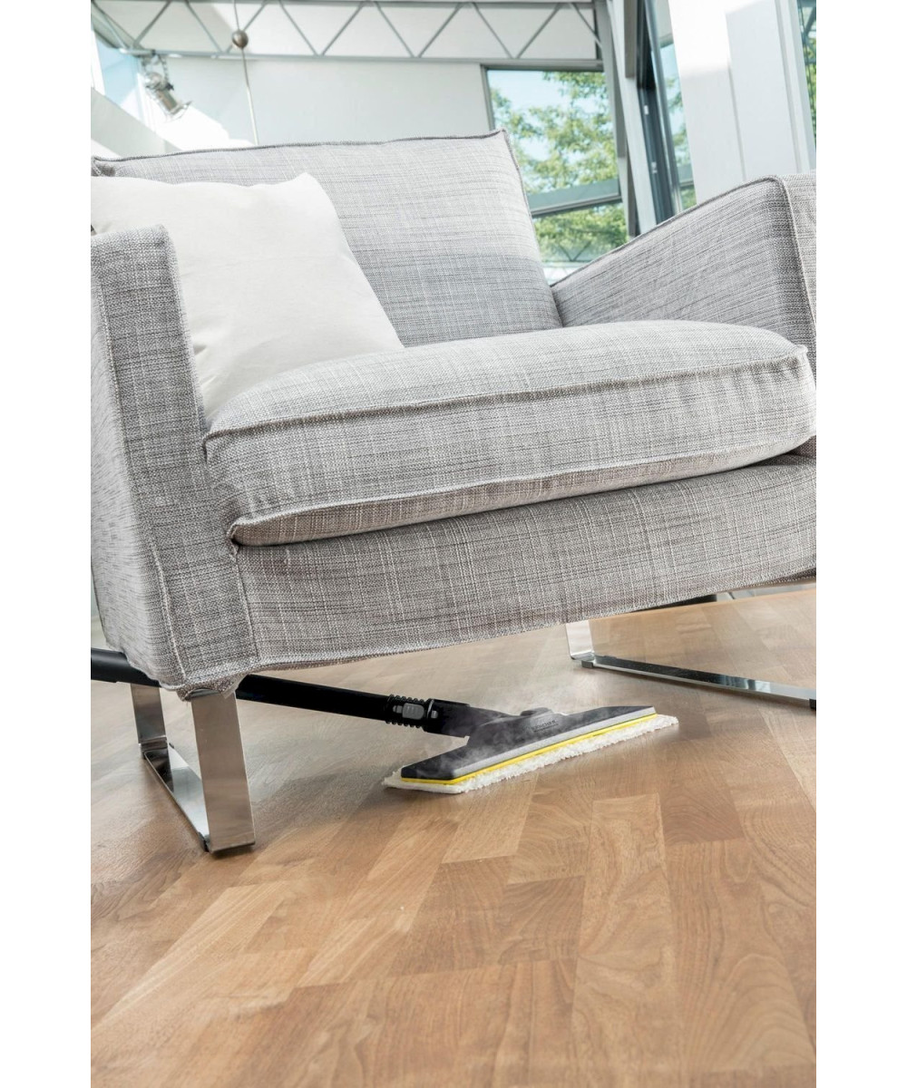 Le nettoyage se veut ainsi ergonomique et efficace tout en assurant un contact intégral avec le sol grâce à l‘articulation flexible de la buse. Ses deux réservoirs (0,5 l fixe + réservoir 1,5 l amovible) lui confèrent une autonomie illimitée pour un nettoyage sans interruption. L'intensité de la vapeur (max 4,2 bars) peut être ajustée à la surface et à la salissure avec le contrôle de la vapeur à 4 niveaux. Grosse brosse ronde, power buse, adaptateur tapis/moquette et seconde serpillière inclus dans la version Premium.