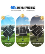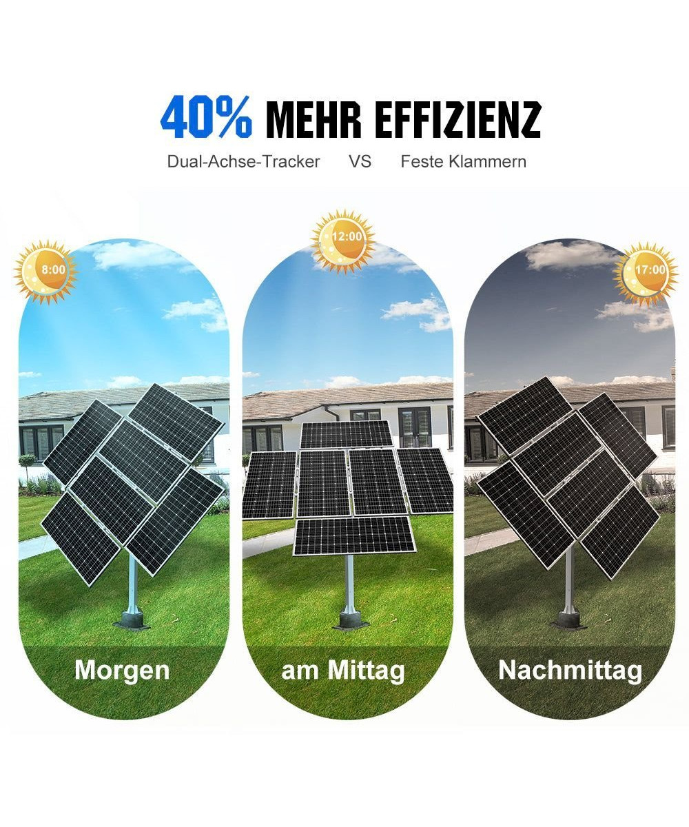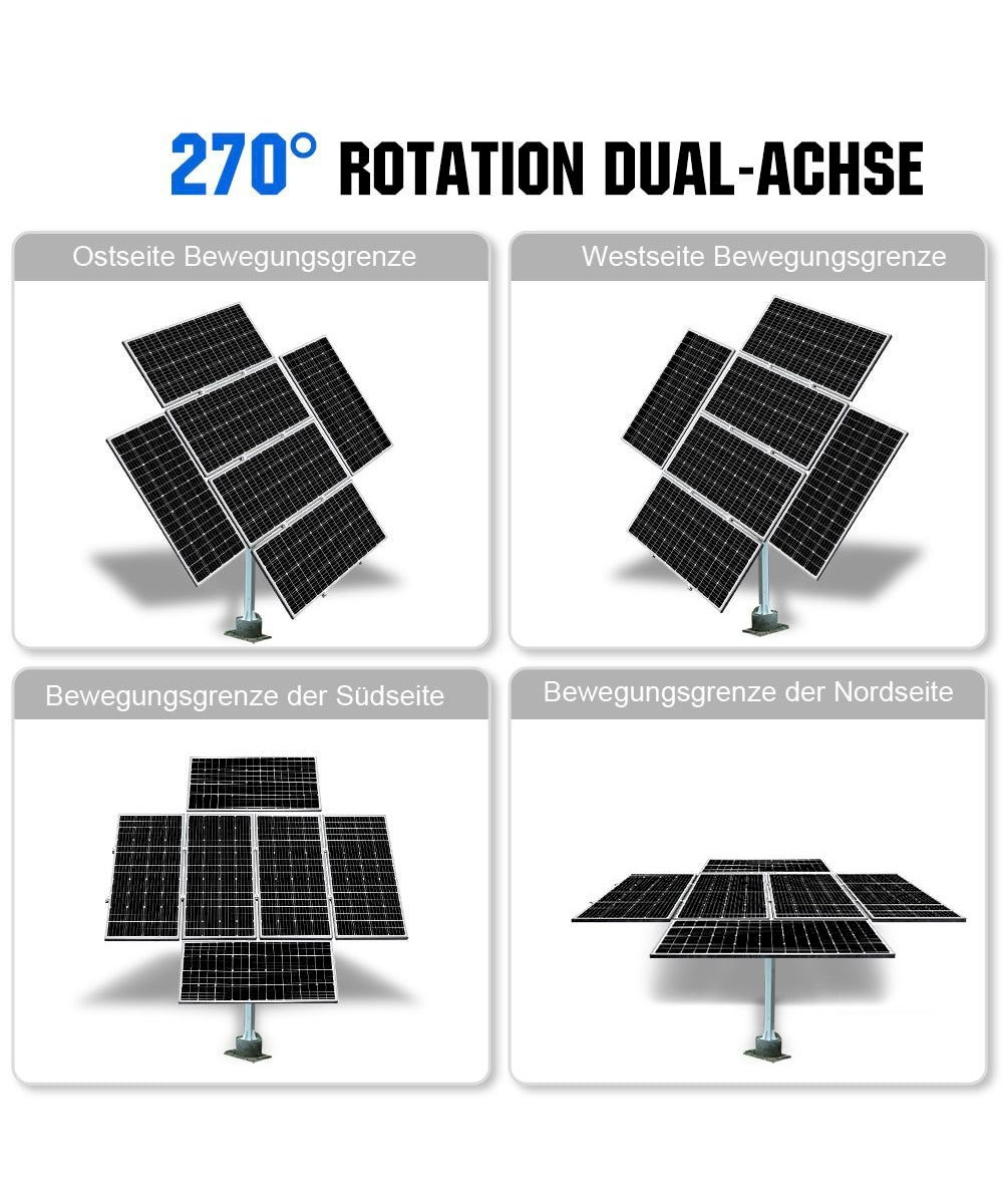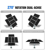 Grâce à un entraînement à double axe et à un capteur de lumière haute sensibilité, le suiveur solaire peut pivoter à 270°, absorbant ainsi la lumière du soleil de tous les côtés. - Augmentation de la production d'électricité