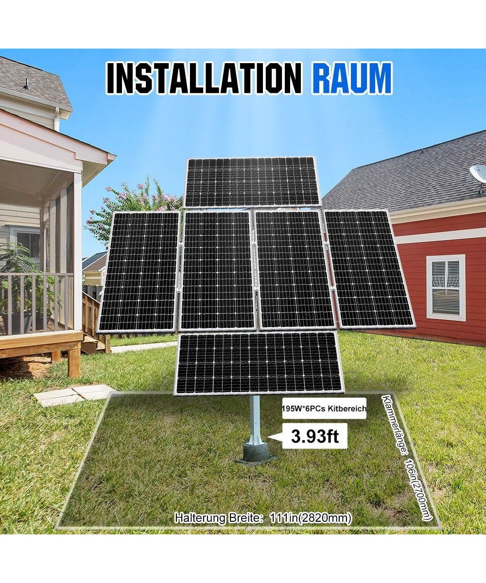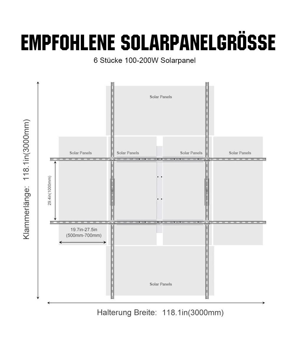 Espace conçu pour accueillir 6 panneaux ECO-WORTHY de 195 W. Pour les autres panneaux, veuillez calculer en fonction de la longueur de la barre transversale. Longueur de la barre transversale : 3000 mm