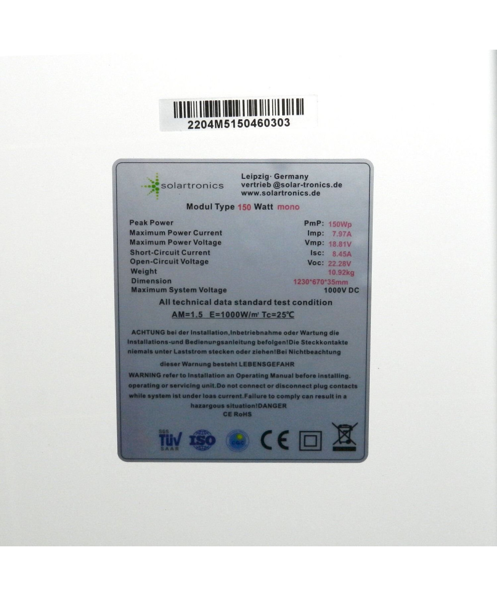 Solartronics Solarmodul 150 W Mono Zellformat Solarpanel Solarzelle 1230x670x35