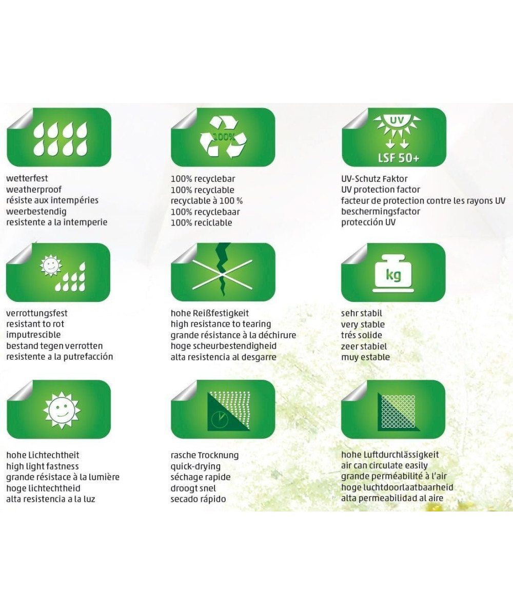 Les fibres oléfine de qualité supérieure font de la housse en tissu un compagnon fidèle pour de nombreuses années. L'épaisseur et la résistance du tissu confèrent à la housse de rechange Sun Garden EasySun TM une durabilité inégalée. Grâce à un revêtement imperméable, il reste sec sous le parapluie en cas de pluie légère. Un véritable polyvalent.