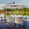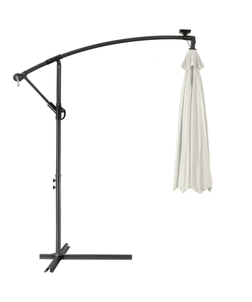 Ce parasol suspendu offre une conception très spéciale à plusieurs avantages. Puisque l’ombrelle est fixée à une barre horizontale plutôt qu’à un poteau central, le poteau et la base n’auront donc besoin d’aucun espace sous l’ombrelle, ce qui permettra d’utiliser au maximum la zone ombragée . Cet avantage est très bénéfique pour l’industrie de la restauration, puisqu'un petit nombre de parasol peuvent apporté de l’ombre à une très grande surface.