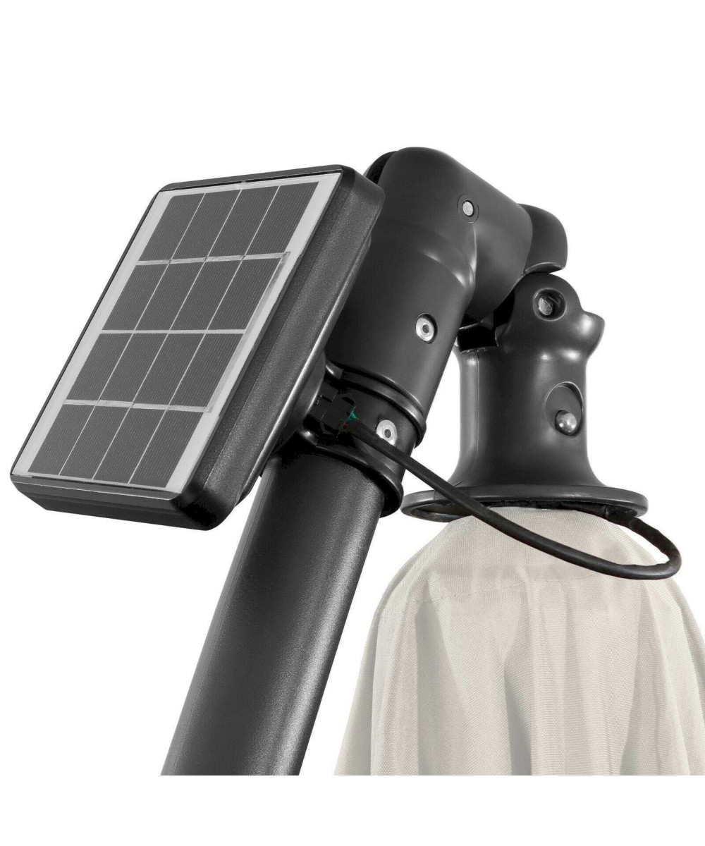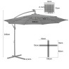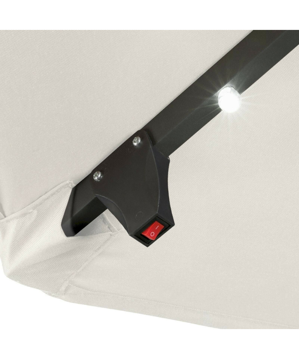 L’éclairage à 40 LED pouvant être allumé ou éteint manuellement créeront une lueur scintillante pendant les nuits d'été clémentes. La batterie intégrée sera rechargée pendant la journée par le module solaire fourni. Créez une atmosphère chaleureuse tout en réduisant vos coûts en électricité et votre empreinte sur l’environnement. Un total de 8 baleines soutient le parasol. L'angle d'inclinaison et la hauteur peuvent être réglés individuellement . Ouvrez l’ombrelle facilement en utilisant la manivelle pratique.