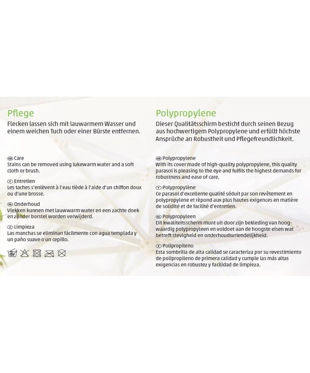 Les fibres oléfine de qualité supérieure font de la housse en tissu un compagnon fidèle pour de nombreuses années. L'épaisseur et la résistance du tissu confèrent à la housse de rechange Sun Garden EasySun TM une durabilité inégalée. Grâce à un revêtement imperméable, il reste sec sous le parapluie en cas de pluie légère. Un véritable polyvalent.